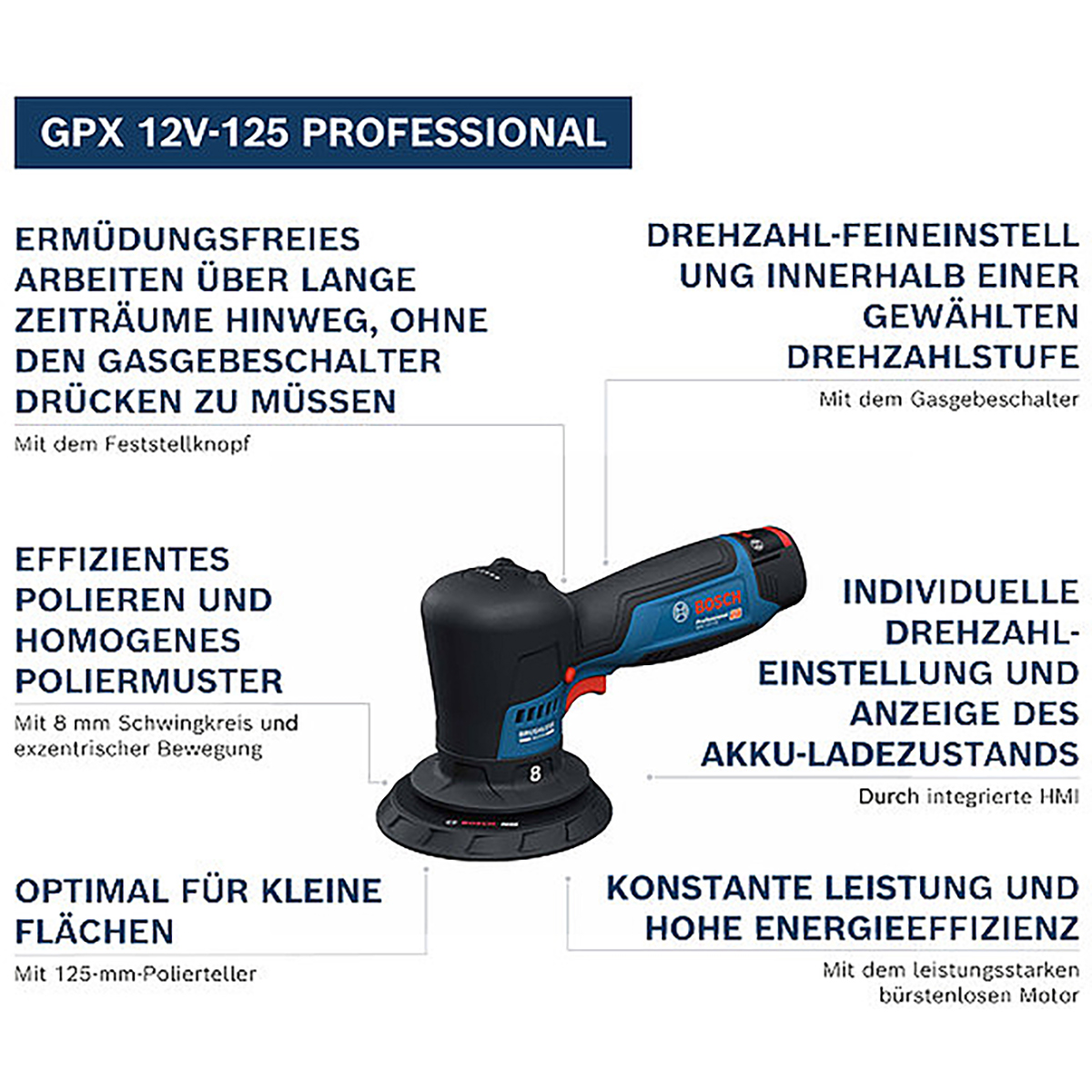 - Erweiterte Produktinformationen Akku-Polierer GPX 12V-125 von BoschPräzises Polieren mit maximaler KontrolleAnwendernutzen:Konstante Leistung dank bürstenlo… Mehr