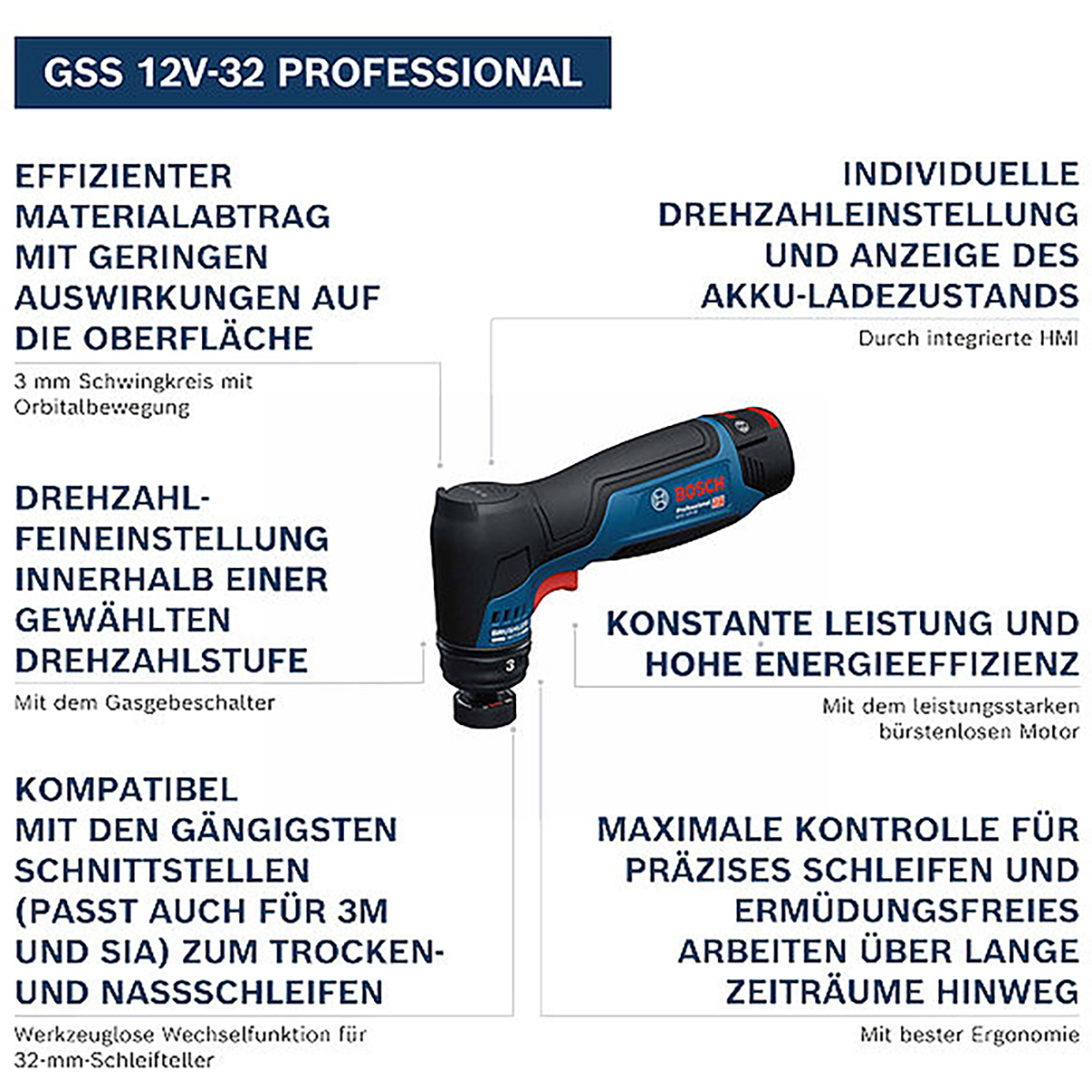 Effizientes Punktschleifen für Ergebnisse mit hervorragender OberflächengüteAnwendernutzen:- Hohe Leistung mit kraftvollem Bosch Professional 12V System und bürstenlosem Motor