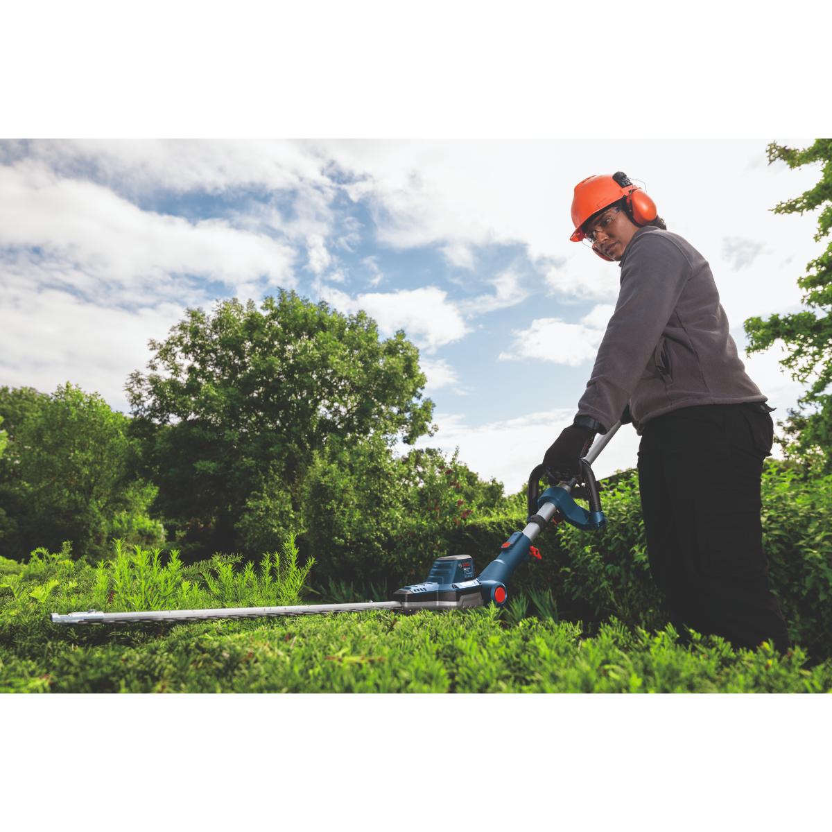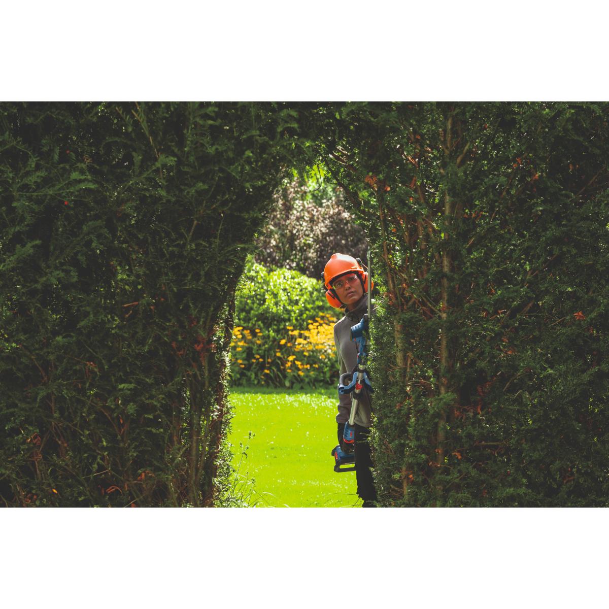 Ergonomische, vielseitige, kabellose Stabheckenschere zum Trimmen von hohen Hecken und kleineren Büschen - Die Akku-Stabheckenschere PRO GHE18V-50FP eignet sich ideal für den Schnitt von hohen Hecken, ganz ohne Benzin und lästige Abgase. Diese leistungsstarke Heckenschere kann dank des Auslösers für variable Geschwindigkeiten und des patentierten Bosch Anti-Blockier-Systems dickere und höhere Äste problemlos und ohne Verklemmen schneiden. Mit dem ergonomischen 360°-Zusatzhandgriff lässt sich die Heckenschere einfach manövrieren. Zudem sorgt der Griff dafür, dass das Gerät bequem und sicher in der Hand liegt. Der abgewinkelte Schneidkopf ermöglicht Schnitte aus verschiedenen Winkeln für einen sauberen oberen und seitlichen Abschluss von Hecken. Darüber hinaus wiegt dieses ergonomische Werkzeug nur 4,2 kg (ohne Akku). Es bietet eine optimale Balance, ist leicht zu handhaben und reduziert die Ermüdung bei längeren Einsätzen.Die Akku-Stabheckenschere PRO GHE18V-50FP eignet sich perfekt für den Schnitt von hohen Hecken und von kleineren Sträuchern und Büschen. Dieses Gerät ist robust genug, um dickere Äste und anspruchsvollere Hecken zu bearbeiten. Gleichzeitig ist es auch präzise genug für feinere Schnitte. Es ist kompatibel mit dem Bosch Professional 18V System und der markenübergreifenden AMPShare Akku-Allianz.