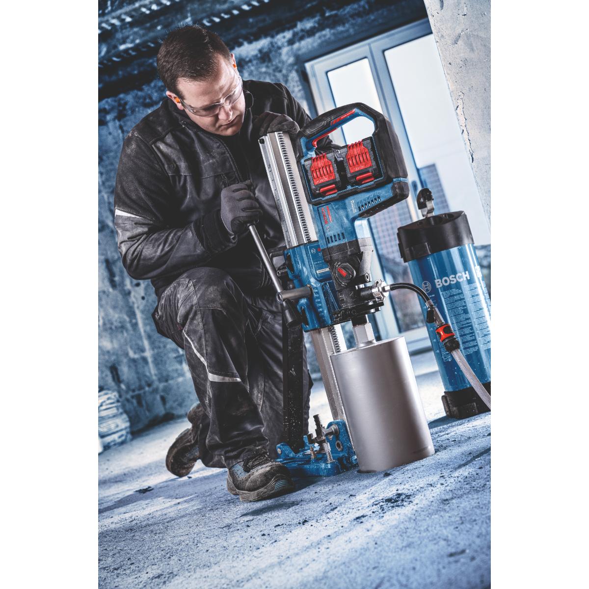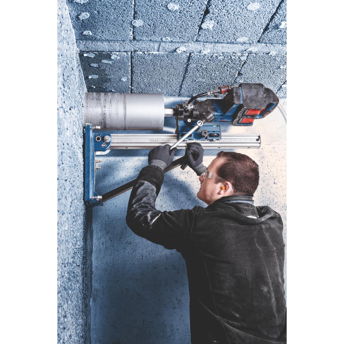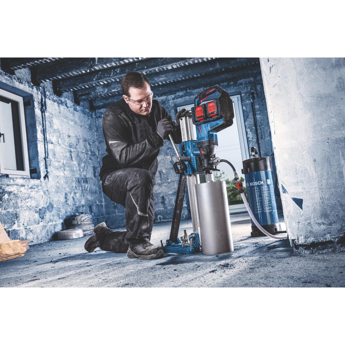 Der Diamantbohrständer PRO GCR180(II) für Präzisionsarbeit - Der PRO GCR180(II) ist der erste vollwertige Diamantbohrständer von Bosch für den Einsatz mit EXPERT EXDB18V2-180 und PRO GDB180WE. Dieser robuste Ständer erleichtert das Diamantbohren dank einer langlebigen Aluminiumsäule mit hoher Torsionsfestigkeit und einem 45°-Drehgelenk. Der PRO GCR180(II) bietet nicht nur eine stabile Abstützung, sondern hilft dir auch mit einem Bohrerzentrierer, einer Wasserwaage und einer Bohrtiefenskala beim Anvisieren und Lokalisieren des Bohrlochs. Er sorgt mit seinem 60-mm-Schnellspannfutter und einem kombinierten Fuß, die per Anker oder Vakuum montiert werden kann, für einen bequemen und leichten Auf- und Abbau. Die Kurbel kann entfernt und zum Einstellen aller Schrauben verwendet werden.Dieser Diamant-Kernbohrständer ist für den Einsatz mit EXPERT EXDB18V2-180 und PRO GDB180WE beim Bohren von großen Löchern in Beton oder Mauerwerk an Wand, Decke oder Fußboden sowie für Heizungs-, Klima-, Wasser- und Elektroanlagen usw. geeignet.