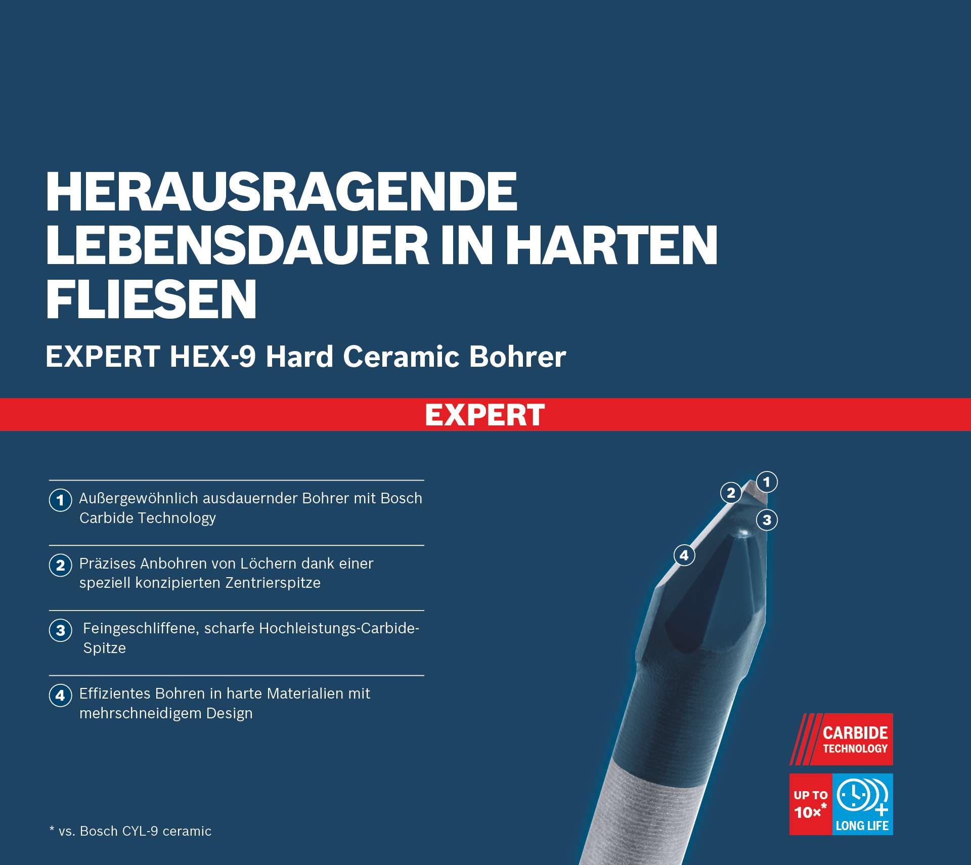 - Produktinformation EXPERT HEX-9 Hard Ceramic HEX-9 Bohrer-Set, 5 x 90 mm, 5-tlg. von BoschHält bis zu 10-mal länger als ein Bosch CYL-9 Soft Ce… Mehr