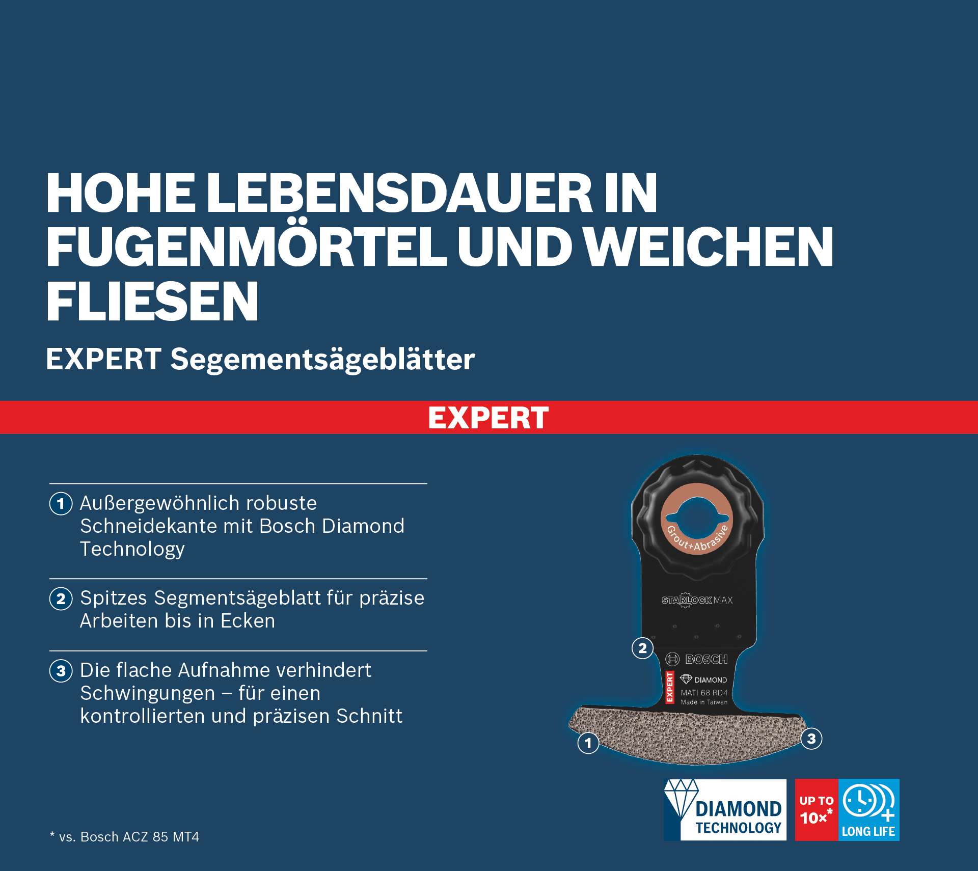 Hält bis zu 10-mal länger als ein laserverschmolzenes Carbide-Blatt Bosch ACZ 85 MT4 - Das Entfernen der Fugenmasse zwischen den Fliesen ist eine Aufgabe, die Bad- und Kücheninstallateure regelmäßig durchführen müssen. Multifunktionswerkzeuge sind dafür ideal geeignet, aber manchmal ist es schwierig, in die Ecken oder um Armaturen herum zu gelangen. Mit dem EXPERT Corner Blade Blatt ist dies kein Problem. Es bietet nicht nur eine lange Lebensdauer und schnelle Entfernung des Mörtels, sondern erreicht auch problemlos Ecken. Das Bosch EXPERT Corner Blade für Multifunktionswerkzeuge ist das perfekte Zubehör für Fliesenleger und Bad- oder Kücheninstallateure. Aufgrund seiner extrem langen Lebensdauer und Vielseitigkeit sollte es in deinem Werkzeugkasten ganz oben liegen. Außergewöhnlich robuste Schneidekante mit Bosch Diamond Technology- Spitzes Segmentsägeblatt für präzise Arbeiten bis in Ecken