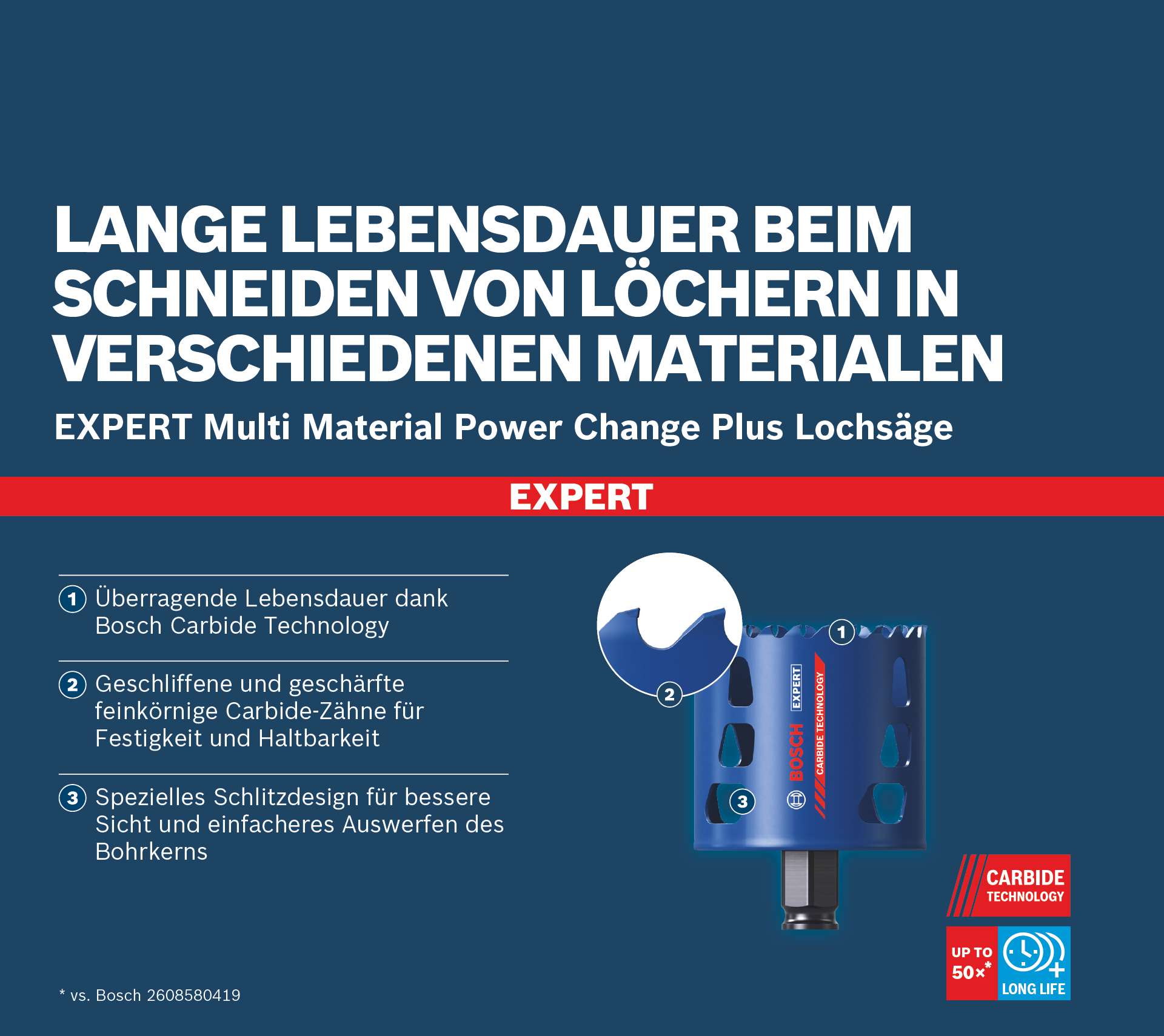 - Erweiterte Produktinformationen EXPERT Multi Material Power Change Plus-Lochsäge, 40 x 60 mm von BoschHält in zähen Materialien bis zu 50-mal länger als die… Mehr
