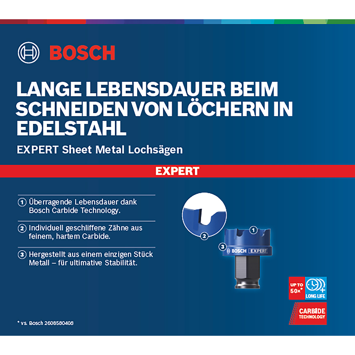 Lange Lebensdauer beim Schneiden von Löchern in Edelstahl - Die EXPERT Sheet Metal besteht aus einem einzigen Zylinder aus gedrehtem Metall – für ultimative Stabilität, Robustheit und Genauigkeit. Extreme Lebensdauer und die Fähigkeit, die härtesten Stahlsorten zu schneiden – durch Carbide-Zähne, die einzeln geschärft und auf den Körper gelötet werden. Zur Verwendung mit dem Power Change Plus-Schnellspann-Adapter von Bosch: für Genauigkeit und Robustheit.