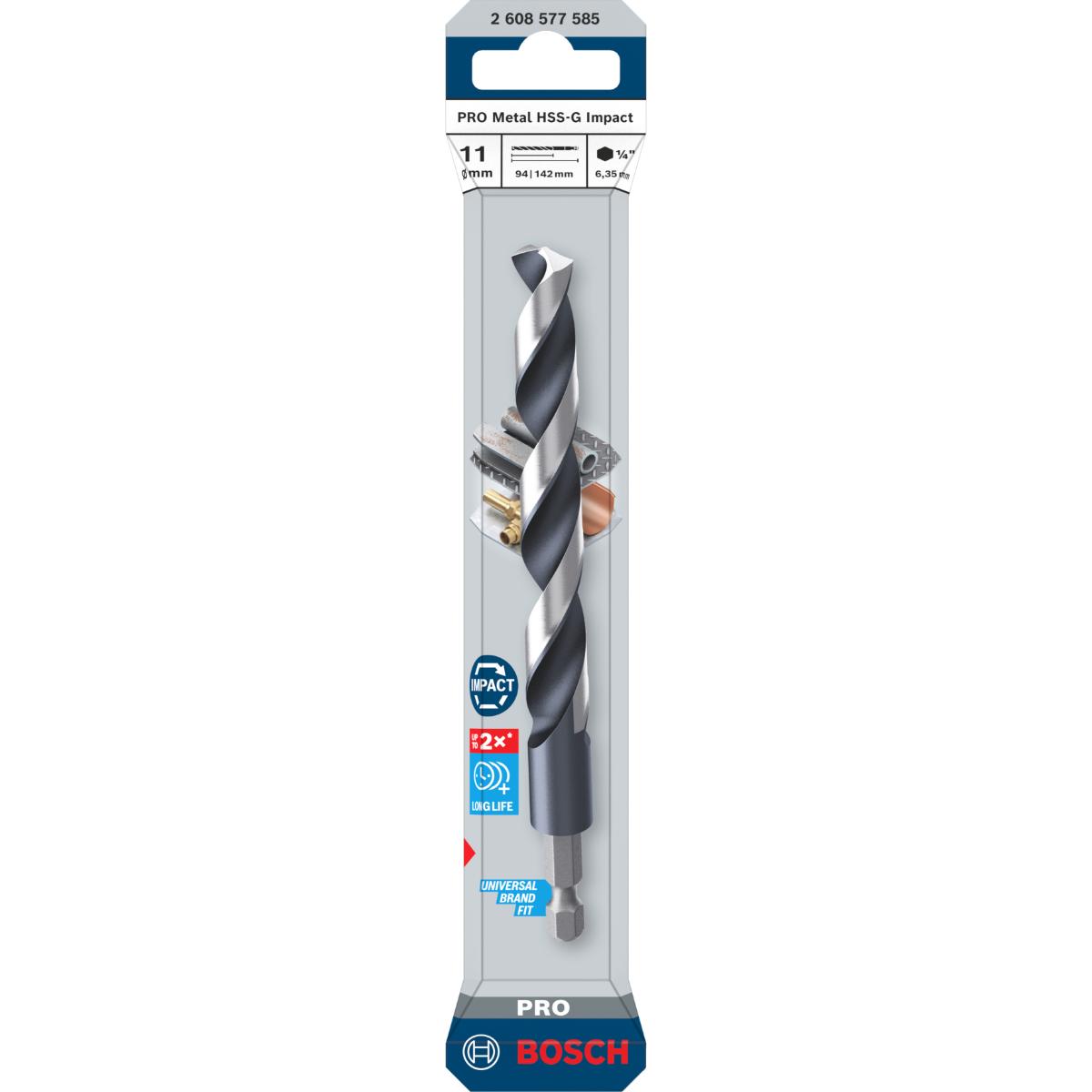 - Erweiterte Produktinformationen PRO Metal HSS-G Impact Spiralbohrer, 11 x 94 x 142 mm von BoschHält bis zu 2x länger als ein Bosch PointTeQ Bohrer - Bist du… Mehr