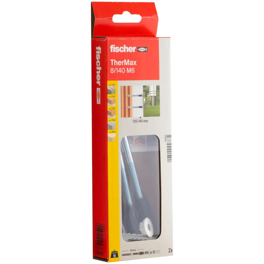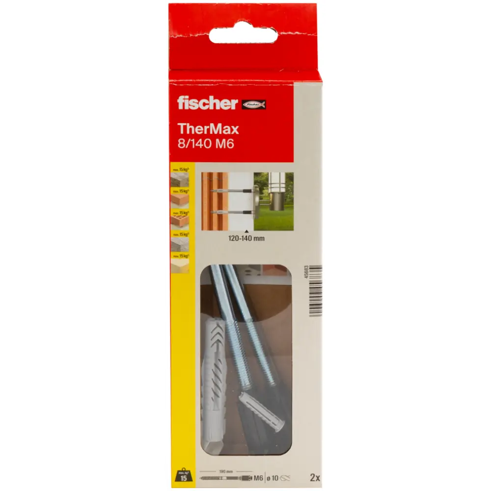 Das fischer Abstandsmontagesystem TherMax 8 ist eine Lösung zur Befestigung in der Außenwand ohne Wärmebrücken im WDVS. Die Stockschraube mit dem glasfaserverstärkten Konus fräst sich selbstschneidend durch den Putz in den Dämmstoff. Die Stockschraube wird bei der Montage in den Universaldübel UX gedreht und verankert somit sicher im Baustoff. Der Anti-Kälte-Konus am Kopf der Stockschraube unterbricht die Wärmebrücke und nimmt die äußere Befestigung auf. Der TherMax befestigt leichte Lasten wie Leuchten, Briefkästen oder Blitzableiter in Beton, Porenbeton und Mauerwerk aus Loch- und Vollstein.Baustoff
