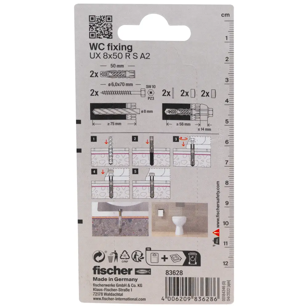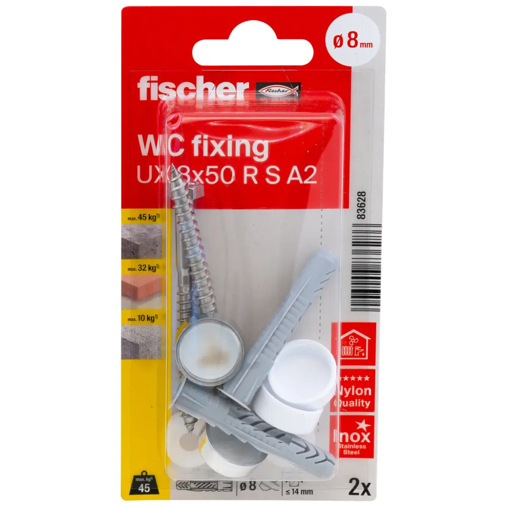 Das fischer Befestigungsset WC N beinhaltet alle Elemente zur sicheren Befestigung von Stand-WCs, Spiegeln und Keramikablagen: 2 fischer Universaldübel UX R aus hochwertigem Nylon, 2 Schrauben aus nicht rostendem Stahl mit Sechskantkopf, 2 Abdeckkappen und 2 Fixierringe. Der enthaltene fischer Universaldübel UX ist für die Befestigung in allen Baustoffen geeignet.Baustoff