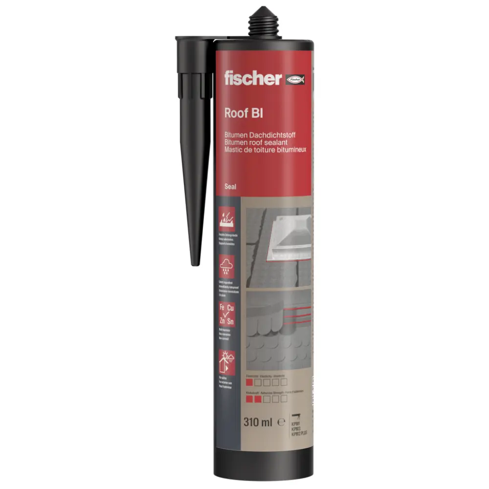 Der fischer Dachdichtstoff Roof BI besteht aus einer speziellen Rezeptur auf Bitumen-Basis, dichtet Dachbahnen und Dachpappen sehr sicher und dauerhaft ab. Auch verwendbar zum Verkleben von Bitumenschindeln, Ausfugen von Dachdurchbrüchen, wie Schornsteine oder Lichtkuppeln. Haftet ohne Grundierung auch auf feuchten Untergründen. Wirkt nicht korrosiv und ermöglicht den Einsatz auf Aluminium, Kupfer und verzinkten Oberflächen.Anwendung