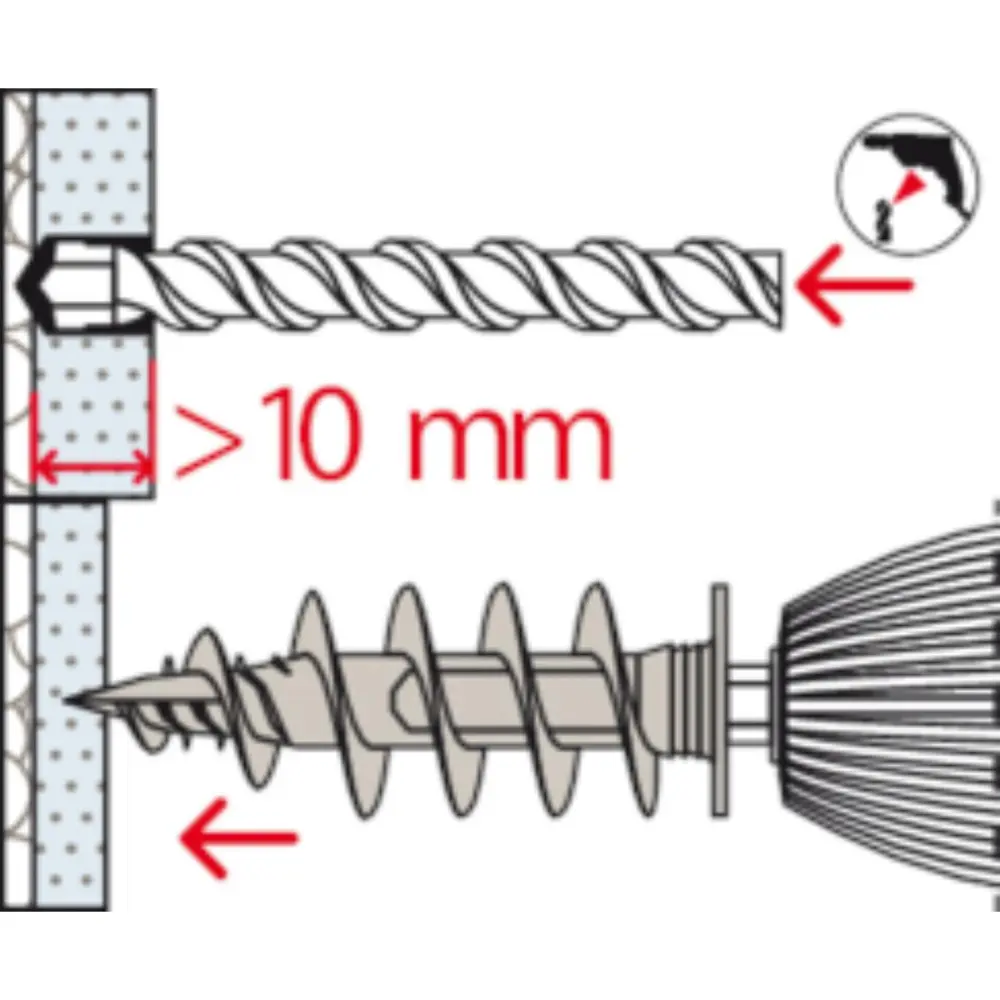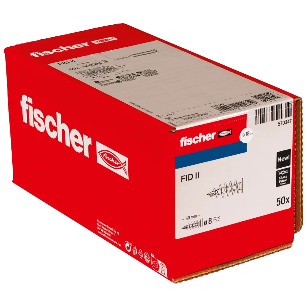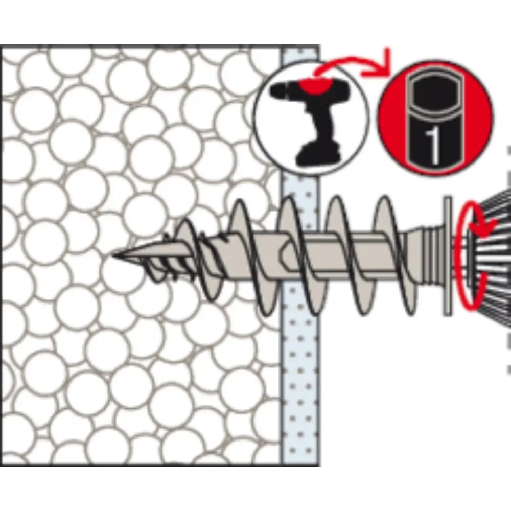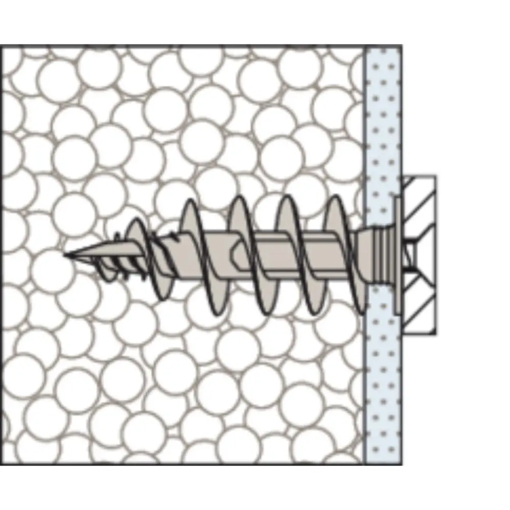 Der fischer Dämmstoffdübel FID II eignet sich für die Befestigung von leichten Anbauteilen an Wärmedämmverbundsystemen. Dank der kombinierten Zentrier-, Fräs- und Schneidefunktion der Dübelspitze kann der FID II punktgenau eingeschraubt werden. Der geringe Kopfdurchmesser in Kombination mit den Unterkopffrästaschen des Dübels sorgen für ein perfekt verdecktes und oberflächenbündiges Setzbild. Besonders geeignet ist der FID II zur Befestigung von leichten Anbauteilen wie Außenlampen, Hausnummern oder Türklingeln am WDVS.Baustoff