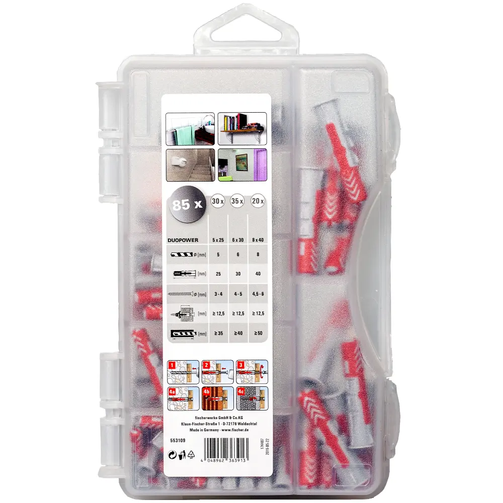 Die fischer DuoPower-Box Mini enthält den fischer DuoPower vorsortiert in drei Abmessungen: 30 DuoPower 5 x 25, 35 DuoPower 6 x 30 sowie 20 DuoPower 8 x 40.