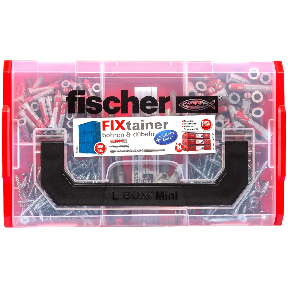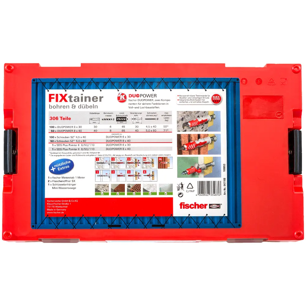 Der FixTainer bohren & dübeln enthält die neue Leistungsklasse - den fischer DuoPower vorsortiert in den Abmessungen 6 x 30 und 8 x 40. Dazu die passenden Schrauben und der jeweils passende Hammerbohrer SDS Plus Pointer II. Nützliche Extras wie einen fischer Meterstab 1 Meter, zwei Flaschenöffner SX und einen Schlüsselanhänger Mini Wasserwage runden das praktische Set ab.Baustoff