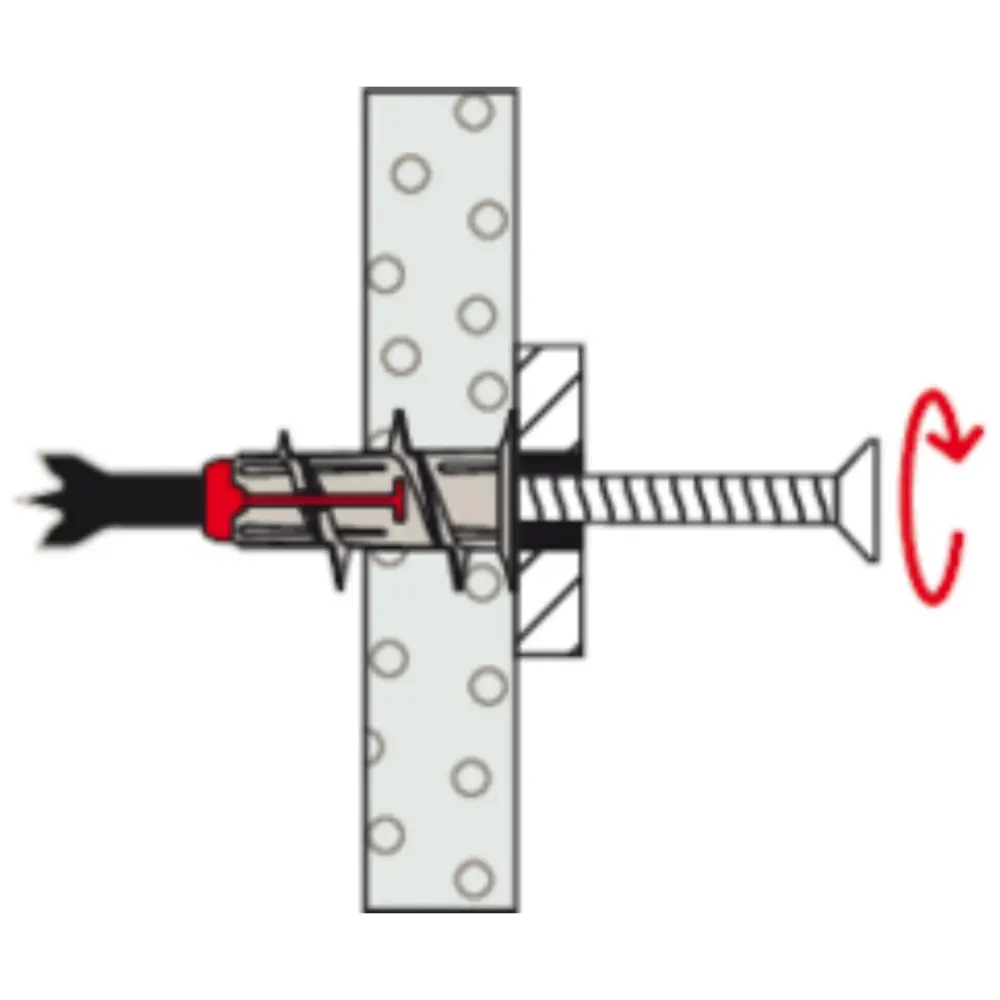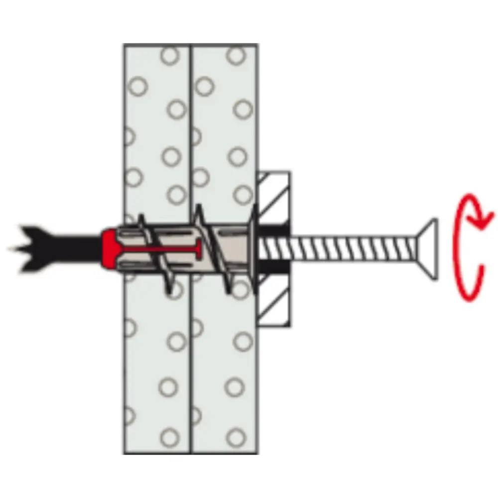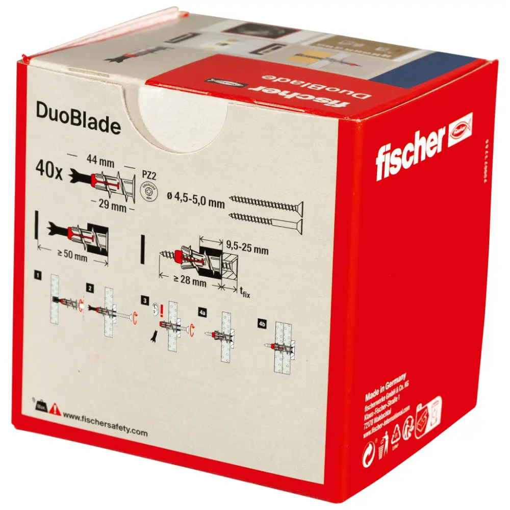 Der fischer DuoBlade ist Teil der innovativen DuoLine und besteht somit aus mehreren Komponenten für bestmögliche Performance. Die selbstbohrende Bohrspitze ermöglicht einen sauberen und effektiven Bohrvorgang. Der Dübel wird in der Vorsteckmontage mit einem Akku-Schrauber oder Schraubendreher oberflächenbündig in die Gipskartonplatten eingedreht. Der fischer DuoBlade ist abgestimmt auf Holz-, Blech- und Spanplattenschrauben von 4 bis 5 mm Stärke sowie unterschiedlichen Haken und Ösen. Dadurch ist er universell geeignet, um z.B. Rauchmelder, Vorhangstangen und Jalousien sicher und schnell zu befestigen. Der DuoBlade wird mit einem herkömmlichen PZ 2 Antrieb in die Gipskartonplatte gesetzt. Es wird kein Sonder-Setzgerät benötigt. Die selbstbohrende Bohrspitze ermöglicht einen sauberen und effektiven Bohrvorgang. Der Dübel wird in der Vorsteckmontage mit einem Akku-Schrauber oder Schraubendreher oberflächenbündig in die Gipskartonplatten eingedreht. Der fischer DuoBlade ist abgestimmt auf Holz-, Blech- und Spanplattenschrauben von 4 bis 5 mm Stärke sowie unterschiedlichen Haken und Ösen. Dadurch ist er universell geeignet, um z.B. Rauchmelder, Vorhangstangen und Jalousien sicher und schnell zu befestigen. Der DuoBlade wird mit einem herkömmlichen PZ 2 Antrieb in die Gipskartonplatte gesetzt. Es wird kein Sonder-Setzgerät benötigt.Baustoff