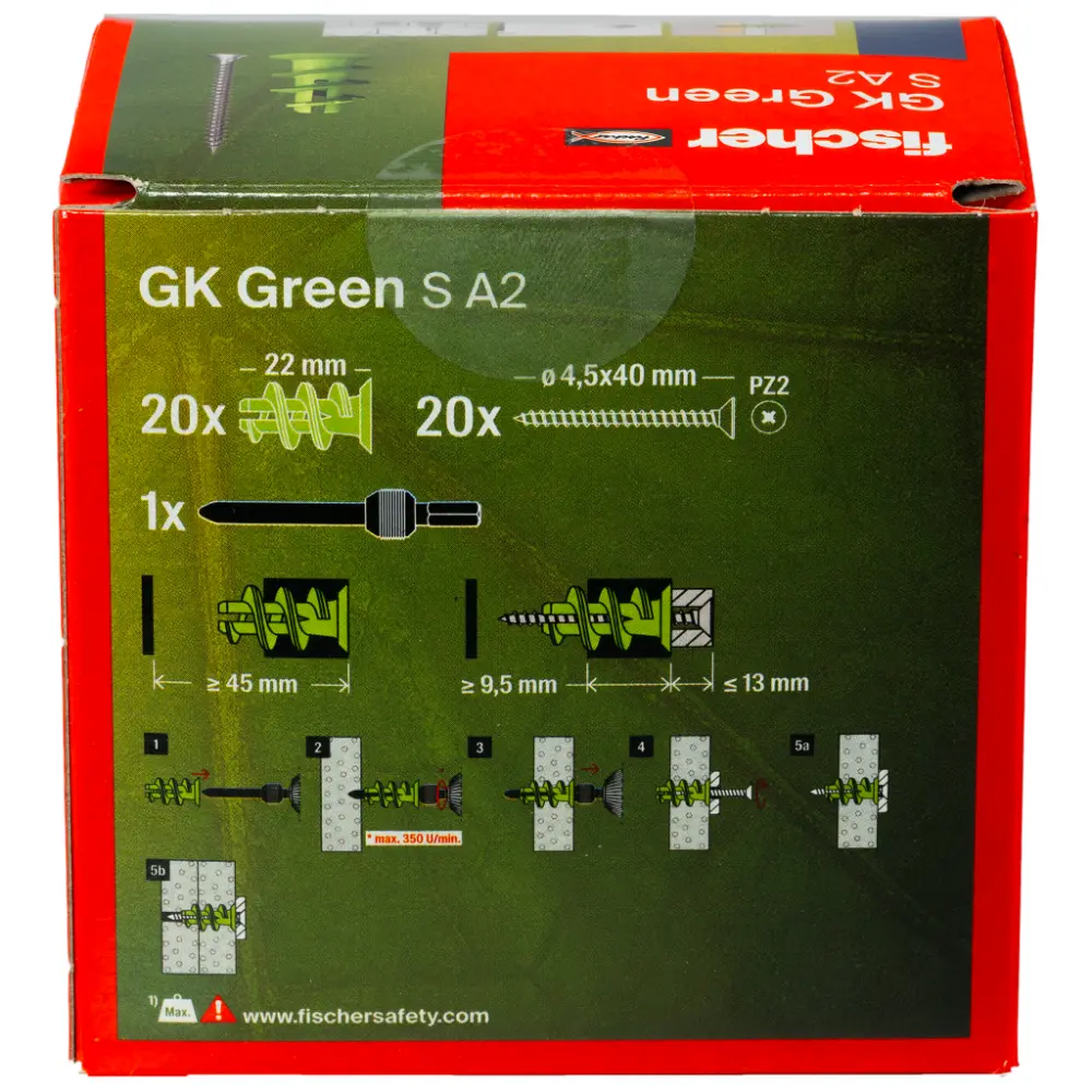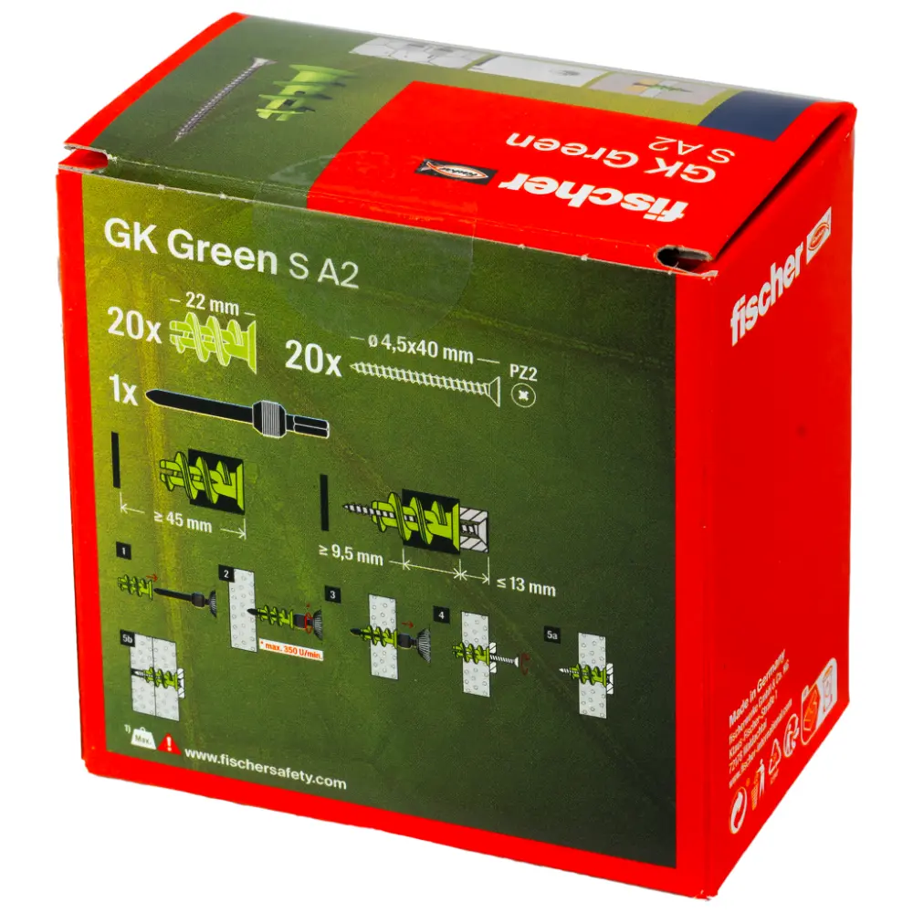 Das Granulat zur Herstellung des fischer Gipskartondübels GK Green wird mindestens zur Hälfte aus nachwachsenden Rohstoffen gewonnen. Diese stehen nicht in Konkurrenz zu Anbauflächen für Nahrungs- und Futtermittel. Der Gipskartondübel GK Green S verfügt über die gleichen Leistungsmerkmale und Tragfähigkeit wie das Original. Der Dübel wird in der Vorsteckmontage mit dem beigefügten Setzwerkzeug mit einem Akku-Schrauber oberflächenbündig in Gipskartonplatten eingedreht. Bis 15 mm Plattenstärke ist kein Vorbohren notwendig. Der fischer GK Green S wird komplett mit Spanplattenschraube geliefert. Dadurch ist er geeignet, um Bilder, Leuchten und Elektroinstallationen sicher und schnell zu befestigen.Baustoff