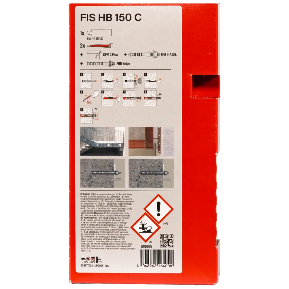 Der fischer Highbond-Spezialmörtel FIS HB 150 C ist eine Systemkomponente des fischer Highbond-Systems FHB II zur Befestigung in ungerissenem und gerissenem Beton. Die Kartusche enthält einen styrolfreien Vinylestermörtel, der mit einer handelsüblichen Dichtstoff-Auspresspistole ausgepresst werden kann. Der Spezialmörtel kann mit den fischer Highbond-Ankerstangen FHB II-A S (Standard), Highbond-Ankerstangen FHB II-A L (lang) aus galvanisch verzinktem Stahl, aus nicht rostendem Stahl und aus hochkorrosionsbeständigem Stahl verwendet werden. Beim Anziehen der Sechskantmutter werden die Konen der Ankerstange in die Mörtelschale gezogen, die sich gegen die Bohrlochwand verspannt. Mit dem fischer Highbond-System FHB II werden Geländer, Maschinen und Stahlkonstruktionen im Innen- und Außenbereich sicher befestigt.Anwendungsbedingungen
