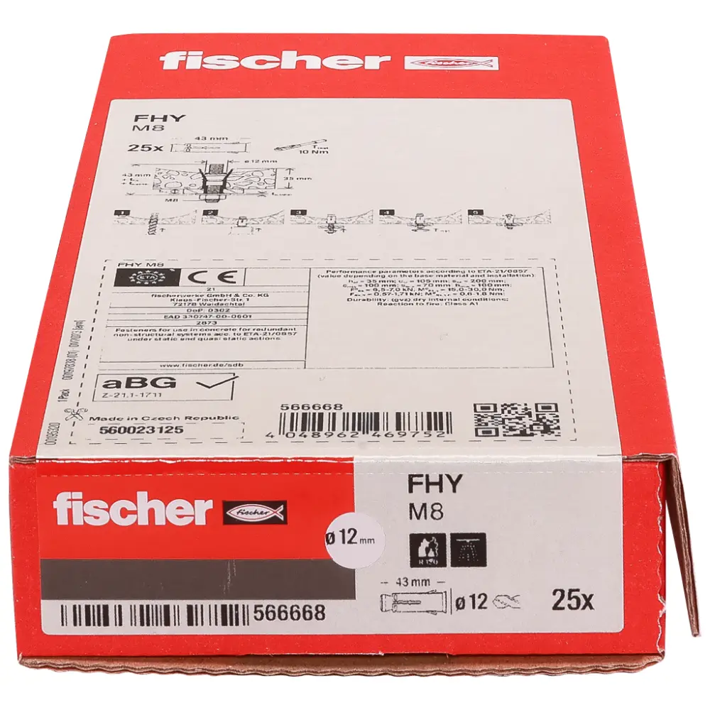 Der fischer Hohldeckenanker FHY ist ein Innengewindeanker aus galvanisch verzinktem Stahl. Der FHY wird in der Vorsteckmontage mit der Hand ins Bohrloch gesetzt und mit dem Hammer bündig zur Oberfläche des Baustoffes eingetrieben. Beim Aufbringen des Drehmoments wird der Konus in die Spreizhülse gezogen. Im Hohlraum spreizt diese auf und im Vollbaustoff verspannt sich diese gegen die Bohrlochwand. Der fischer Hohldeckenanker FHY ist ideal für die Befestigung von Rohrleitungen, Kabeltrassen, Lüftungsleitungen in Spannbeton-Hohlplattendecken im Innenbereich.