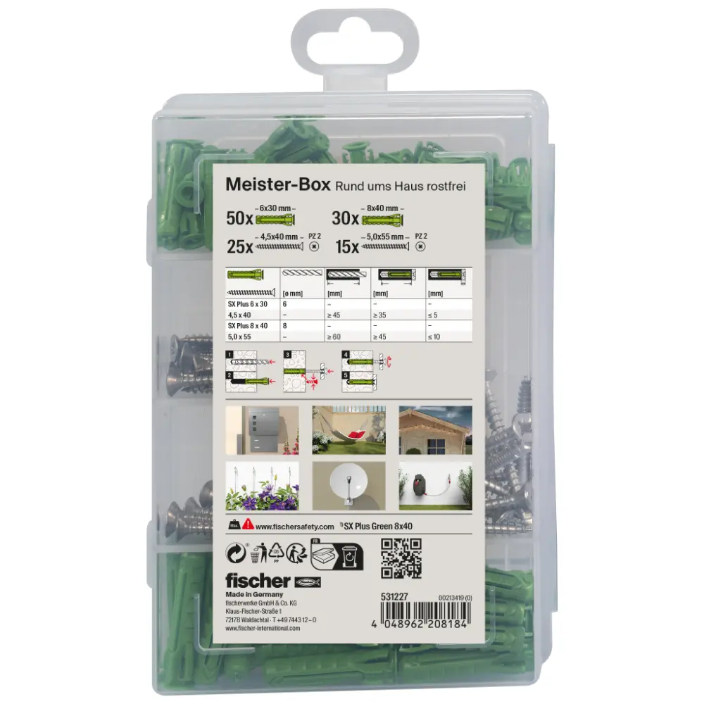 Diese fischer Meister-Box bietet eine praktische und übersichtliche Aufbewahrungslösung als Dübelset für Werkstatt und Baustelle. Der hochwertige, schlagfeste Kunststoffbehälter mit transparentem Deckel ermöglicht jederzeit einen klaren Blick auf den Inhalt. Die vorsortierte 120-teilige Box beinhaltet 50 x SX Plus Green 6 x 30, 30 x SX Plus Green 8 x 40, 25 x Dübelschraube Senkkopf 4,5 x 40 PZ in Edelstahl, 15 x Dübelschraube Senkkopf 5,0 x 55 PZ in Edelstahl - ideal zur Anwendung im Außenbereich. Die 4-fach-Spreizung des SX Plus Dübels gewährleistet eine optimale Krafteinleitung, während der Dübelhals Beschädigungen an Fliesen und Putz verhindert und für eine sichere Verankerung sorgt. Diese Dübel sind optimal für die Vorsteckmontage geeignet, außerdem verhindertder ausgeprägte Dübelrand das Tieferrutschen ins Bohrloch. Der SX Plus eignet sich in Kombination mit den rostfreien Schrauben zur Anbringung von leichten und schweren Gegenständen wie Außenlampen, Briefkästen, Dekorationen und weiteren Befestigungen im Außenbereich in zahlreichen Baustoffen wie Beton, Volllochziegel, Hochlochziegel, Naturstein und Vollgips-Platten.Baustoff