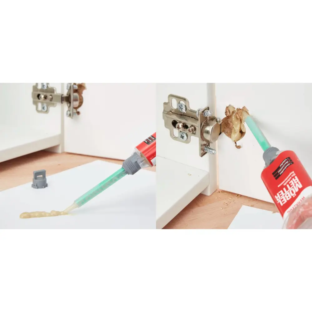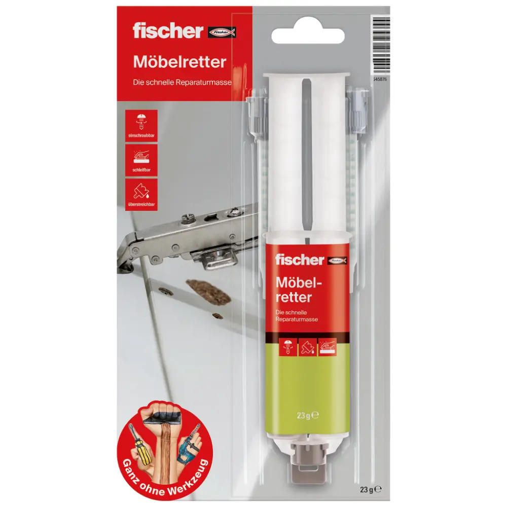 Scharniere reißen gerne mal aus und schwups, hängt die Tür schief. Gut, dass man das so einfach mit dem fischer Möbelretter reparieren kann! Einfach das Loch mit dem Möbelretter auffüllen. Der Kleber, fast wie flüssiges Holz, ist der Retter für alle Möbel im Haushalt. Durch seine Beständigkeit kann er flexibel zur Reparatur von Ihrem Schrank, Ihrer Schublade, oder dem Tisch eingesetzt werden. Durch die extreme Härte kann der Kleber problemlos geschliffen werden. Ist der Kleber ausgehärtet, kann man sogar wieder reinschrauben.