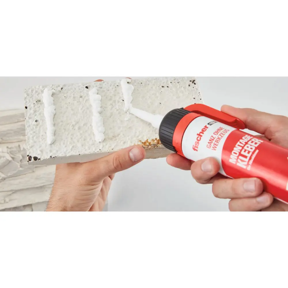 Wer Naturstein, Beton oder Spiegel verkleben will, braucht einen echten Profi. Unser fischer Montagekleber ist der Alleskönner für Hochleistungs-Verklebungen. Denn er sorgt selbst bei rauen und rissigen Untergründen für dauerhafte Klebekraft. Selbst schwere Marmorplatten können mit ihm befestigt werden, ohne hässliche Verfärbungen auf dem schönen Stein zu hinterlassen. Mit dem Montagekleber befestigen Sie ihren Spiegel problemlos ohne ein Loch in die Wand zu bohren. Selbst die Küchenrückwand kann schnell und einfach im Handumdrehen angeklebt werden. Durch die hohe Qualität von fischer ist der fischer Montagekleber wasserbeständig. Damit gewährt er einen langen Halt innen & außen. Die spezielle Kartusche benötigt kein zusätzliches Werkzeug, der Klebstoff kommt auf Knopfdruck gleichmäßig aus der Kartusche. So ist ein sauberes Arbeiten ein Kinderspiel.Anwendung
