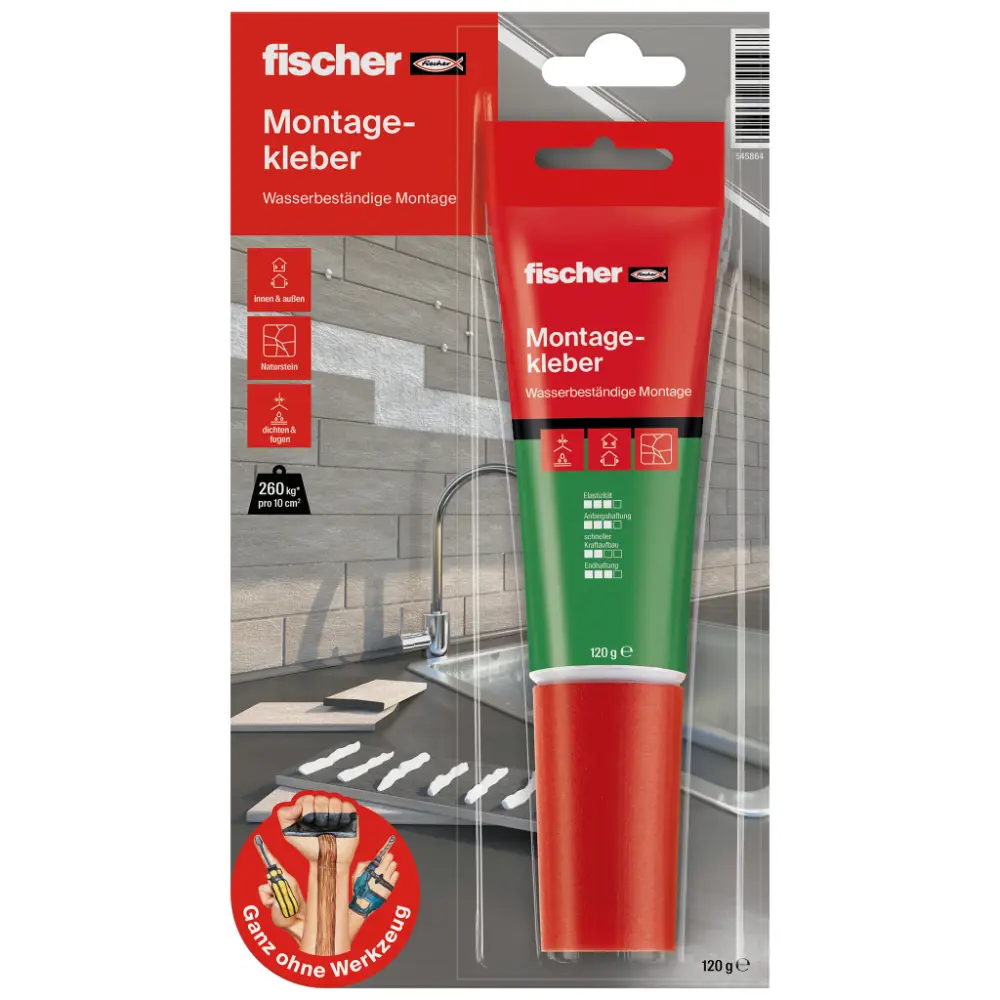 Wer Naturstein, Beton oder Spiegel verkleben will, braucht einen echten Profi. Unser fischer Montagekleber ist der Alleskönner für Hochleistungs-Verklebungen. Denn er sorgt selbst bei rauen und rissigen Untergründen für dauerhafte Klebekraft. Selbst schwere Marmorplatten können mit ihm befestigt werden, ohne hässliche Verfärbungen auf dem schönen Stein zu hinterlassen. Mit dem Montagekleber befestigen Sie ihren Spiegel problemlos ohne ein Loch in die Wand zu bohren. Selbst die Küchenrückwand kann schnell und einfach im Handumdrehen angeklebt werden. Durch die hohe Qualität von fischer ist der fischer Montagekleber wasserbeständig. Damit gewährt er einen langen Halt innen & außen. Die spezielle Kartusche benötigt kein zusätzliches Werkzeug, der Klebstoff kommt auf Knopfdruck gleichmäßig aus der Kartusche. So ist ein sauberes Arbeiten ein Kinderspiel.Anwendung