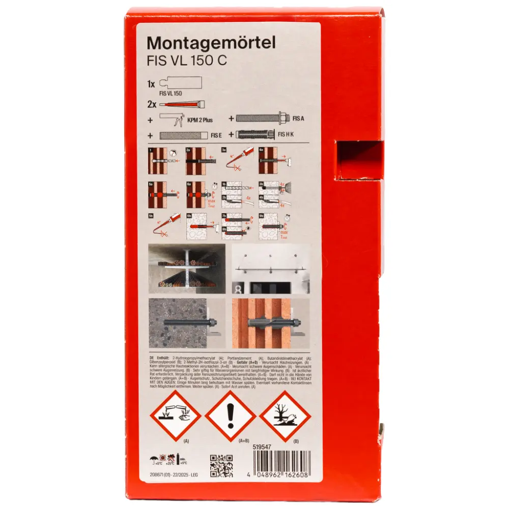 - Produktinformation Montagemörtel FIS VL 150 C von FischerDer fischer Montagemörtel 150 C ist ein 2K-Injektionssystem auf Vinylesterbasis. Harz… Mehr