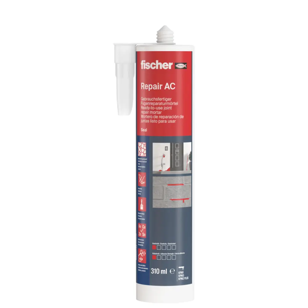 fischer Repair AC, der gebrauchsfertige, spritzbare Reparaturmörtel kann vielseitig eingesetzt werden. Zum Beispiel bei Sanierungen in Mauerwerk, bei der Fixierung von Dachziegeln, beim Verschließen von Bohrlöchern oder allgemeinen Ausbesserungsarbeiten. Der nahezu geruchslose Mörtel lässt sich durch die standfeste Konsistenz leicht verarbeiten. Er bietet sehr gute Witterungs-, Alterungs- und UV-Beständigkeit. Die 1-K Polymer-Dispersion kann bei Temperaturen von +5 °C bis +40 °C verarbeitet werden und ist temperaturbeständig von -30 °C bis +75 °C. fischer Repair AC kann wiederverwendet werden. Bis -15 °C ist er in der Kartusche frostgeschützt.