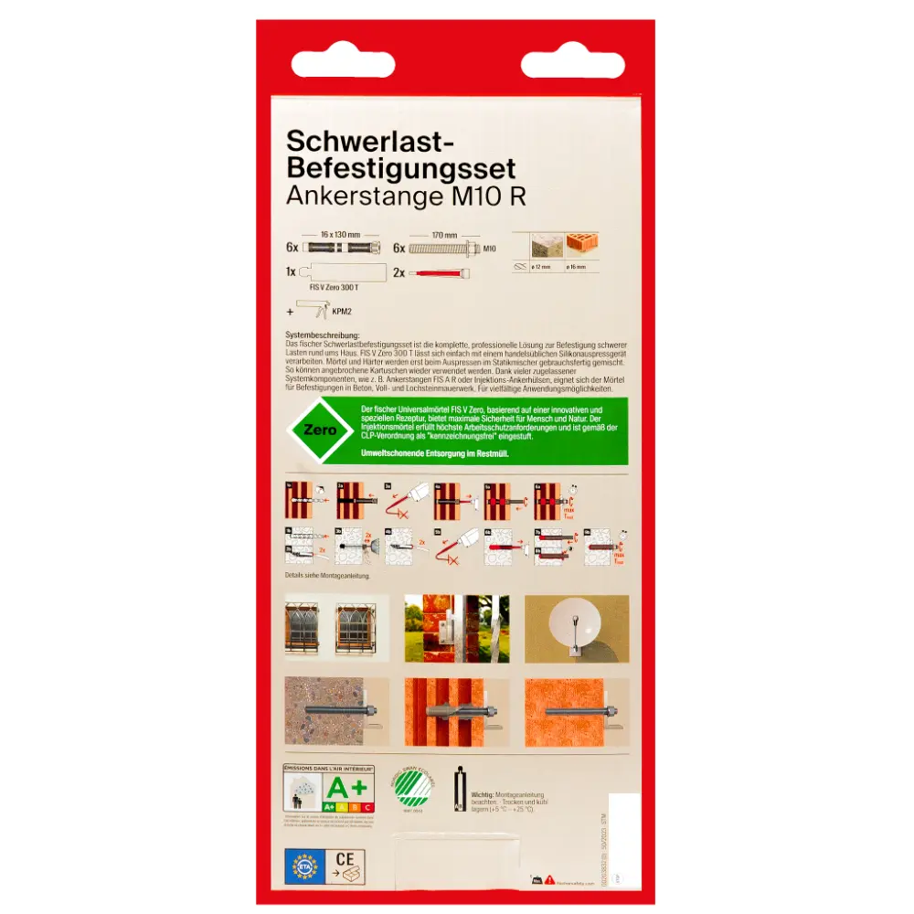 Das fischer Schwerlast-Befestigungsset mit Ankerstange basiert auf einer innovativen und speziellen Rezeptur und bietet maximale Sicherheit für Mensch und Natur. Der Injektionsmörtel erfüllt höchste Arbeitsschutzanforderungen und ist gemäß der CLP-Verordnung als "kennzeichnungsfrei" eingestuft. FIS V Zero ist zugelassen für Befestigungen in gerissenem und ungerissenem Beton, Mauerwerk sowie für nachträgliche Bewehrungsanschlüsse. Auch Spezialanwendungen, wie Verankerungen in wassergefüllten Bohrlöchern, sowie die Installation bei Temperaturen von -10 bis 40°C, sind in der Zulassung geregelt und bieten höchste Flexibilität unter jeglichen Wettereinflüssen.Die recycelte Kartusche mit 50% PCR-Anteil sowie das Etikett mit recyceltem Papier tragen einen wichtigen Teil zur Reduzierung der Rohstoffverschwendung bei und fördern somit die Kreislaufwirtschaft.Prüfzeichen / Zulassungen