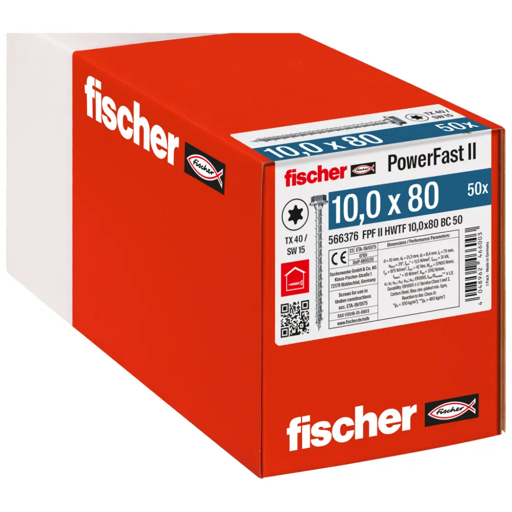 Die fischer Holzbauschraube PowerFast FPF II-HWTF BC ist die kraftvolle Holzbauschraube mit Sechskantkopf und Innenstern-Aufnahme für den konstruktiven Holzbau. Die Holzbauschraube ist die schneller zu verarbeitende Alternative zu Schrauben nach DIN 571. Der Sechskantkopf ermöglicht die Verwendung von Stecknüssen, alternativ garantiert der Innenstern-TX-Antrieb höchste Kraftübertragung bei maximaler Bitstabilität. Das Gewinde ermöglicht das feste Anbinden von Metallelementen an Holz. Die Europäische Technische Bewertung garantiert ein zusätzliches Plus an Sicherheit. Die PowerFast II ist durch die Gewindeform besonders leicht ohne Vorbohren einzuschrauben. Das PowerFast II-Gewinde reicht bis in die Schraubenspitze und sorgt für schnellen Anbiss.Prüfzeichen / Zulassungen