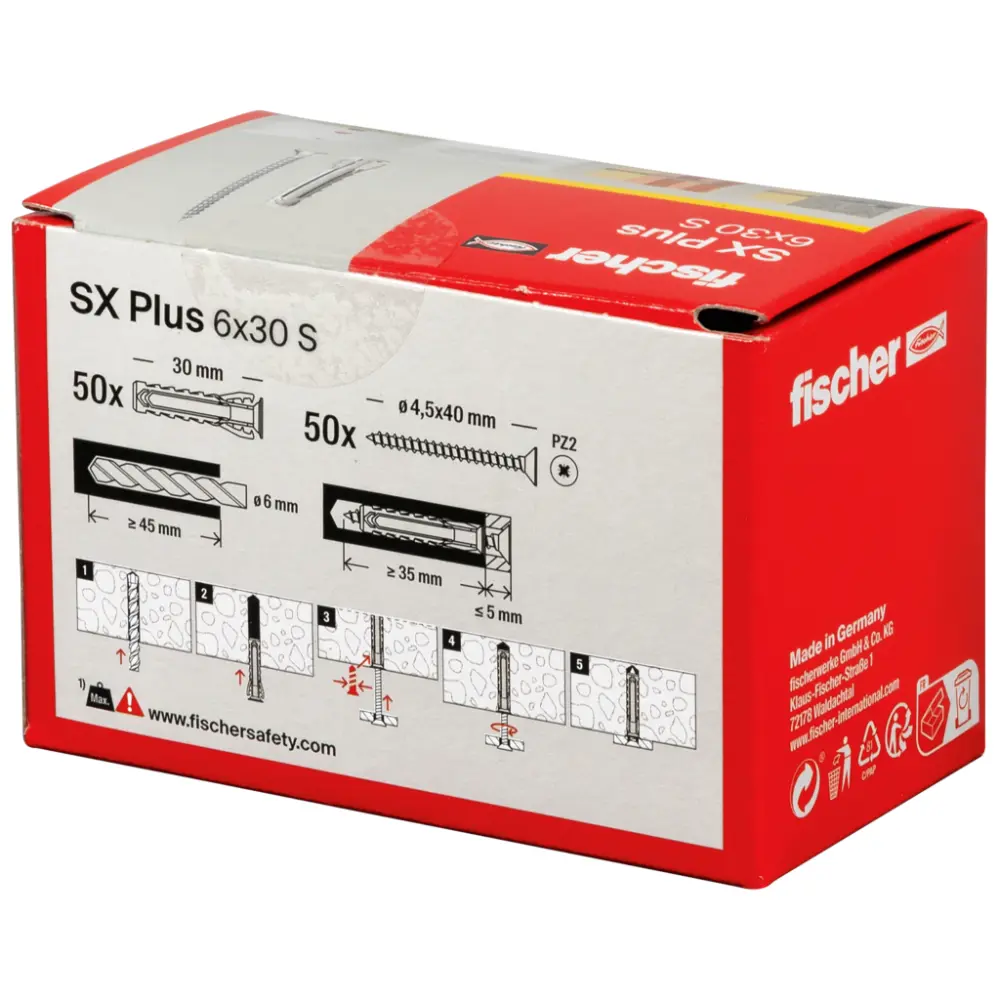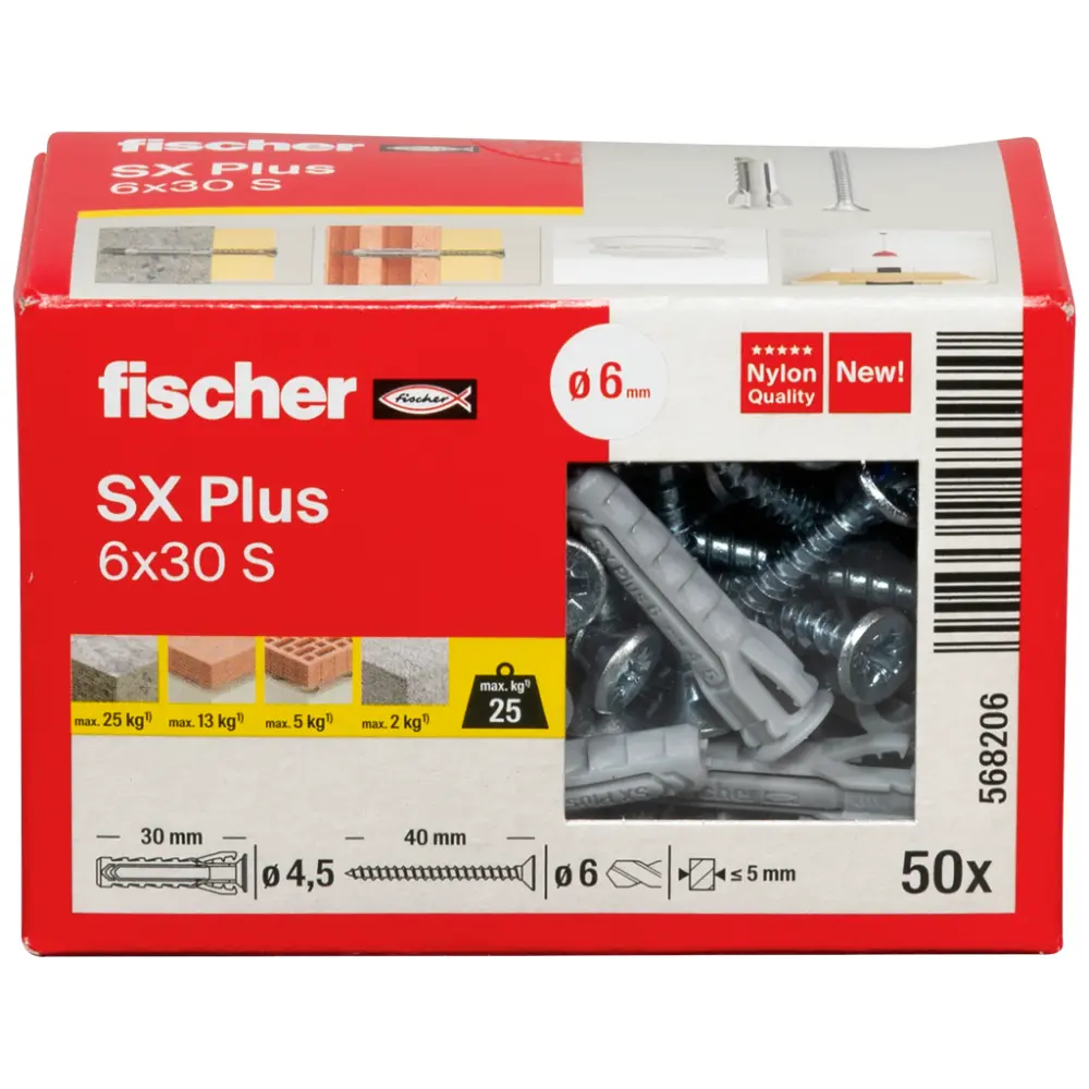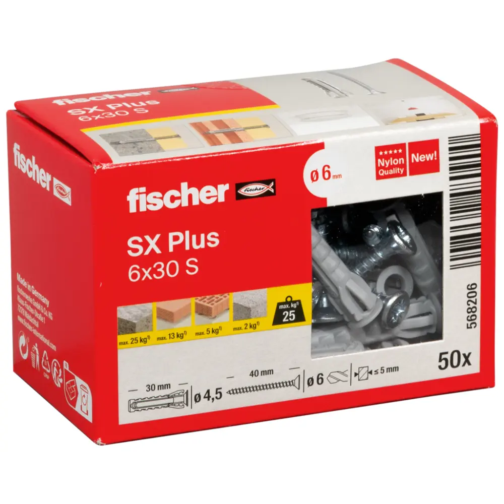Der fischer Spreizdübel SX Plus ist durch seine 4-fach Spreizung der Spezialist für Vollbaustoffe wie Beton, Kalksandstein und Mauerwerk. Die speziellen Fixierflügel sorgen für eine Vorfixierung der Schraube, wodurch diese bei Überkopf Anwendungen nicht zusätzlich festgehalten werden muss. Diese Schraubenfixierung ermöglicht dem Anwender einen flexiblen und komfortablen Setzvorgang. Der flexible Dübelrand verhindert zudem ein Tieferrutschen des Dübels in das Bohrloch für eine sichere Montage. Die mitgelieferten Schrauben sind optimal auf den fischer Spreizdübel SX Plus abgestimmt. Das hochwertige Material aus Nylon garantiert dauerhaft sicheren Halt in einer Vielzahl von Voll- und Lochbaustoffen.