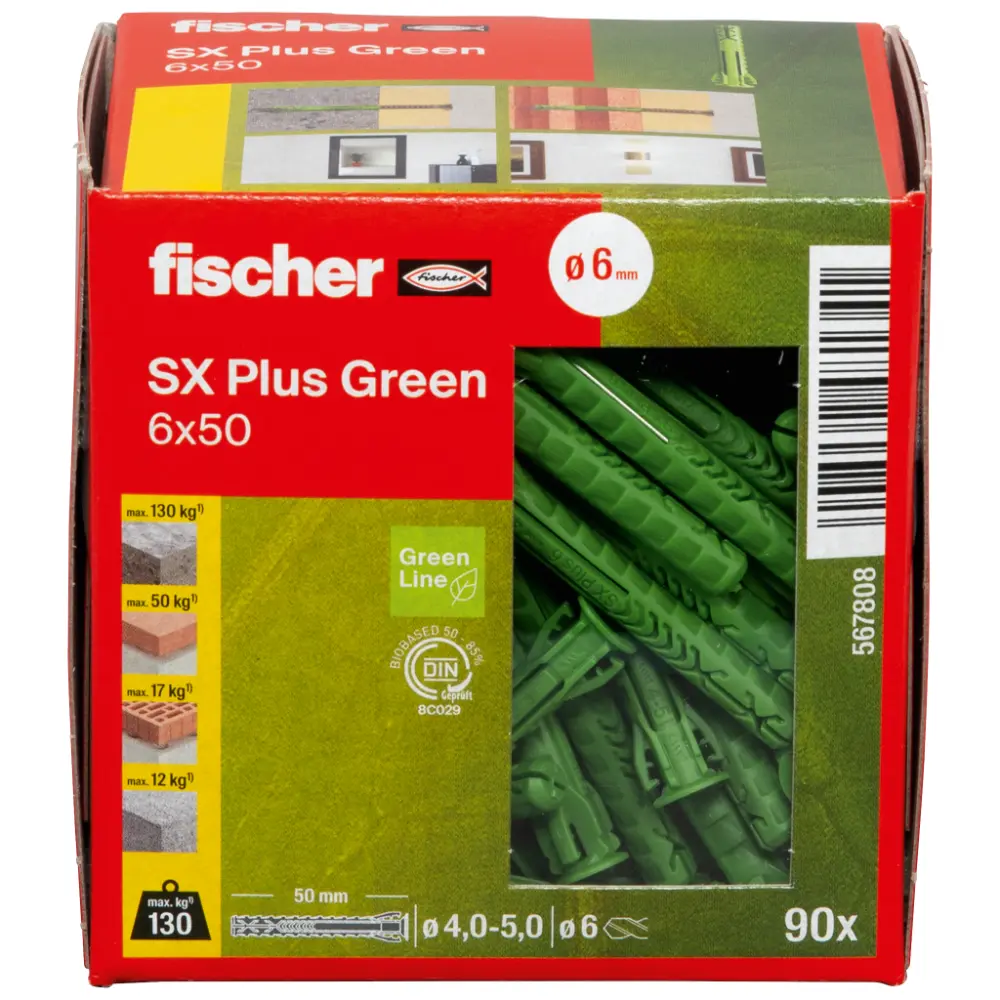 Der fischer Spreizdübel SX Plus Green wird aus mindestens 50% nachwachsenden Rohstoffen hergestellt. Aufgrund seiner 4-fach Spreizung ist er der Spezialist für Vollbaustoffe wie Beton, Kalksandstein und Mauerwerk. Die speziellen Fixierflügel sorgen für eine Vorfixierung der Schraube, wodurch diese bei Überkopf Anwendungen nicht zusätzlich festgehalten werden muss. Diese Schraubenfixierung ermöglicht dem Anwender einen flexiblen und komfortablen Setzvorgang. Der flexible Dübelrand verhindert zudem ein Tieferrutschen des Dübels in das Bohrloch für eine sichere Montage. Diese Variante mit größerer Verankerungstiefe ist Ideal für Befestigungen in Lochbaustoffen, Porenbeton und zur Putzüberdeckung geeignet.