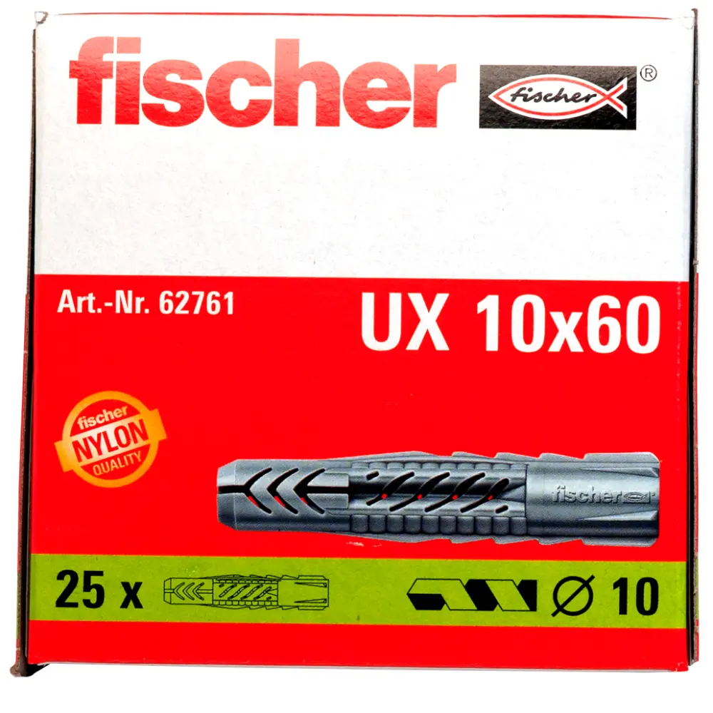 Der fischer Universaldübel UX ist der Allrounder aus hochwertigem Nylon. Der Dübel hält in Beton, aber auch in Porenbeton, in Mauerwerk und Gipskarton- sowie Gipsfaserplatten. In diesen Baustoffen verknotet der Dübel. Mit dem fischer Universaldübel UX lassen sich beispielsweise Leuchten, Gardinenschienen, leichte Schränke und Sockelleisten befestigen.Baustoff