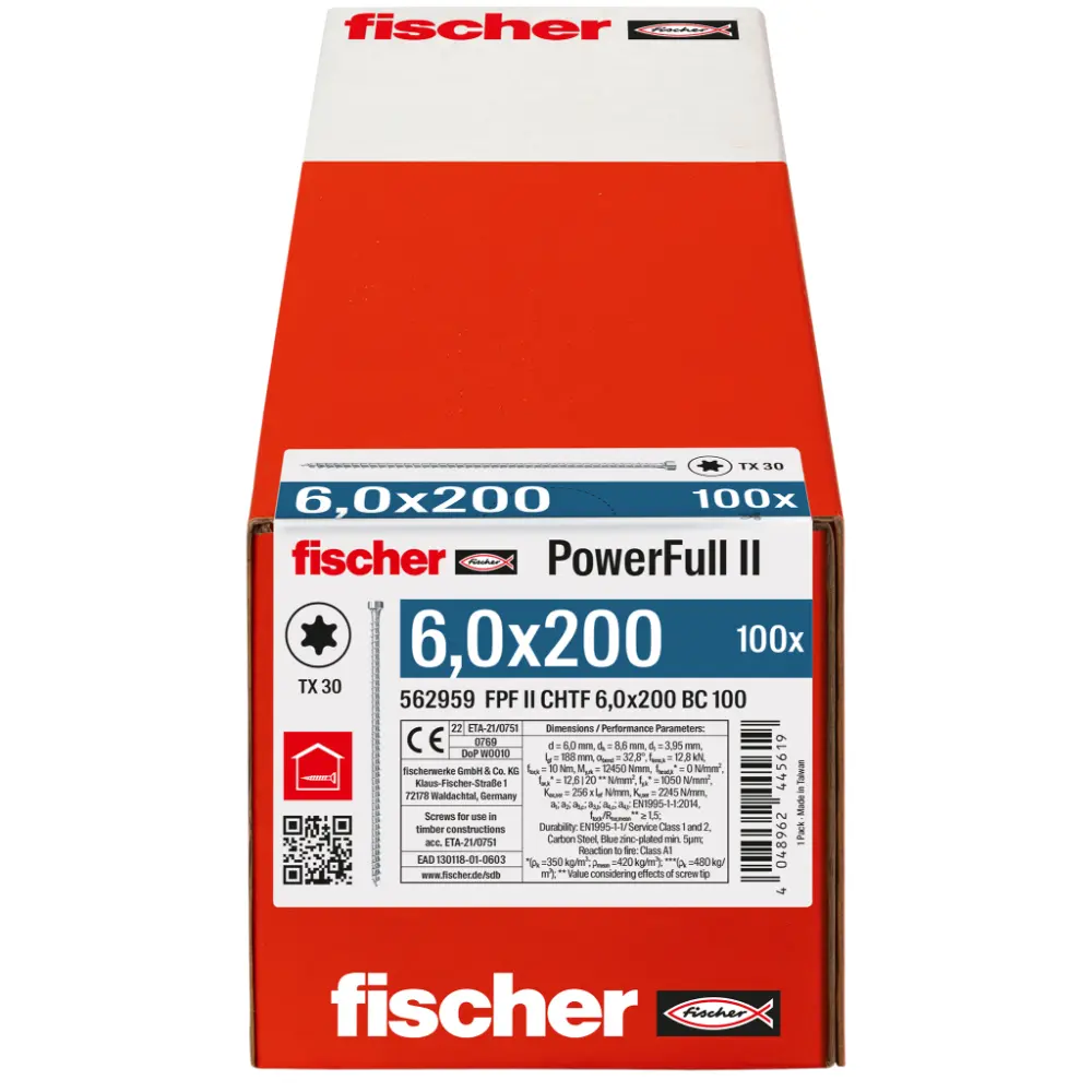 Vollgewindeschraube 6,0x200 PowerFull FPF II CHTF 6/8 BC, Vollgewinde, Zylinderkopf, blau passiviert, TX-Antrieb von Fischer