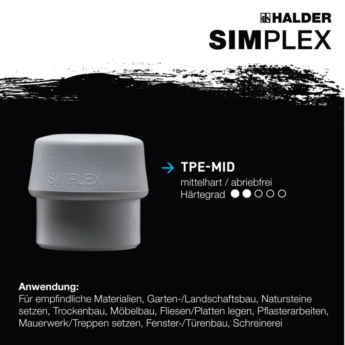 - Erweiterte Produktinformationen Schlageinsatz für SIMPLEX - Schonhammer, TPE-mid von HALDERDer SIMPLEX-Schlageinsatz TPE-mid ist ein Thermoplast Elastomer u… Mehr