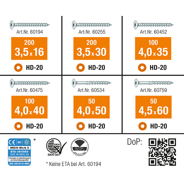 Die HECO-L-BOXX mini enthält eine Auswahl an 700 Schrauben in 6 Abmessungen, inkl. 2 HD-20 Bits. Die Schrauben sind in der Ausführung Senkkopf mit Frästaschen und mit variablem Vollgewinde und Teilgewinde im Sortimentskoffer enthalten. Die genauen Abmessungen siehst du direkt bie den Artikelbildern.