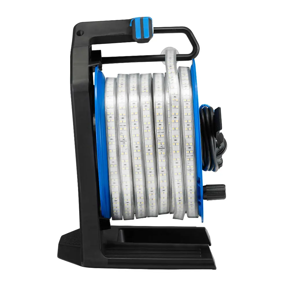 HEDI Lichtband-Trommel Companion mit 25 Metern LED_Lichtband. Die Strom-Zuleitung für das Lichtband auf der Trommel erfolgt über eine 3,0 m lange schwarze Anschlussleitung des Typs H07RN-F 2x1,5 mit Konturenstecker in der Schutzart IP44. Das 25 Meter lange LED-Lichtband hat die Abmessungen von 18x8 mm und erreicht die Schutzart IP65. Die abgegebene Lichtfarbe beträgt 6.500 Kelvin. Die Leistung je Meter beträgt 12 Watt und der Lichtstrom 1.200 Lumen. Eine Verlängerung auf maximal 50 Meter ist möglich. Die Trommel ist robust und mit einem stabilen Tragegestell aus glasfaserverstärktem Kunststoff und einem stabilen Kunststoff-Trommelkörper in blau mit einem Trommeldurchmesser von 250 mm ausgestattet. Einige weitere besondere Merkmale dieser Kabeltrommel sind der ergonomisch geformte, isolierte Soft-Touch Tragegriff, der Drehgriff, die drei Trittflächen zum Aufstellen der Füße beim Auf- und Abwickeln des Lichtbands, der Rotationsstopp-Schalter zur Fixierung des Trommelkörpers, die patentierte 7°-Neigung der Trommel für eine Verlagerung des Trommel-Schwerpunktes sowie die herausnehmbare Lichtband-Halterung und -führung. Die breiten Trommelfüße garantieren einen stabilen Stand der Trommel auch im abgewickelten Zustand. Bestückt ist die Lichtband-Trommel mit einem Thermoschutzschalter, der eine Überhitzung des Lichtbands und der Trommel verhindert. Grundsätzlich ist das Lichtband vor der Benutzung jedoch komplett abzurollen. Diese Ausführung ist zugelassen für den ständigen Einsatz im Freien.Folgende Eigenschaften vereinen alle Modelle der "Companion"-Serie: