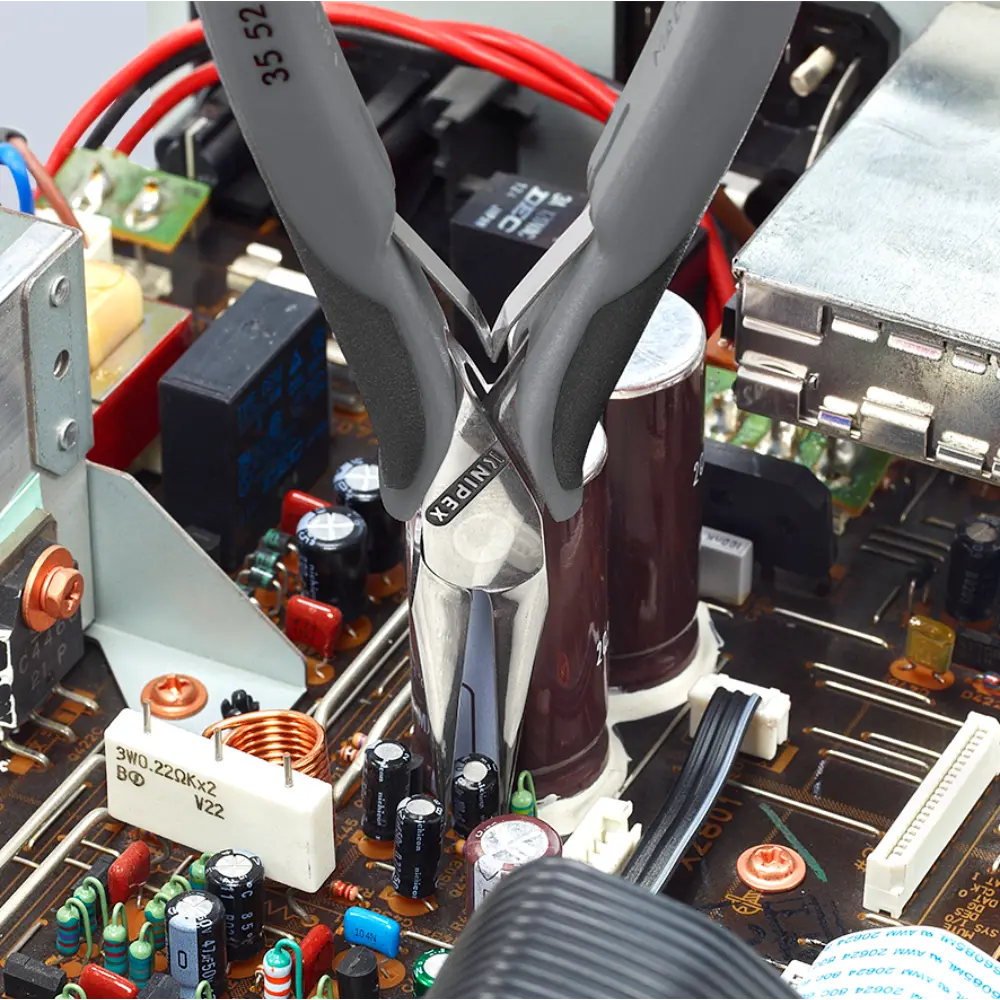 - Schlanke, zum Zangenkopf hochgezogene Hüllen für feines und komfortables Greifen zwischen Daumen und Zeigefinger
