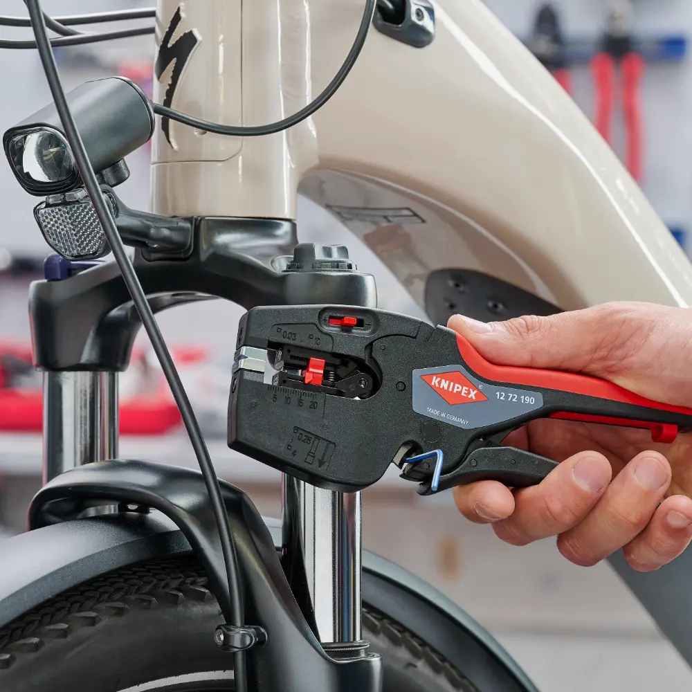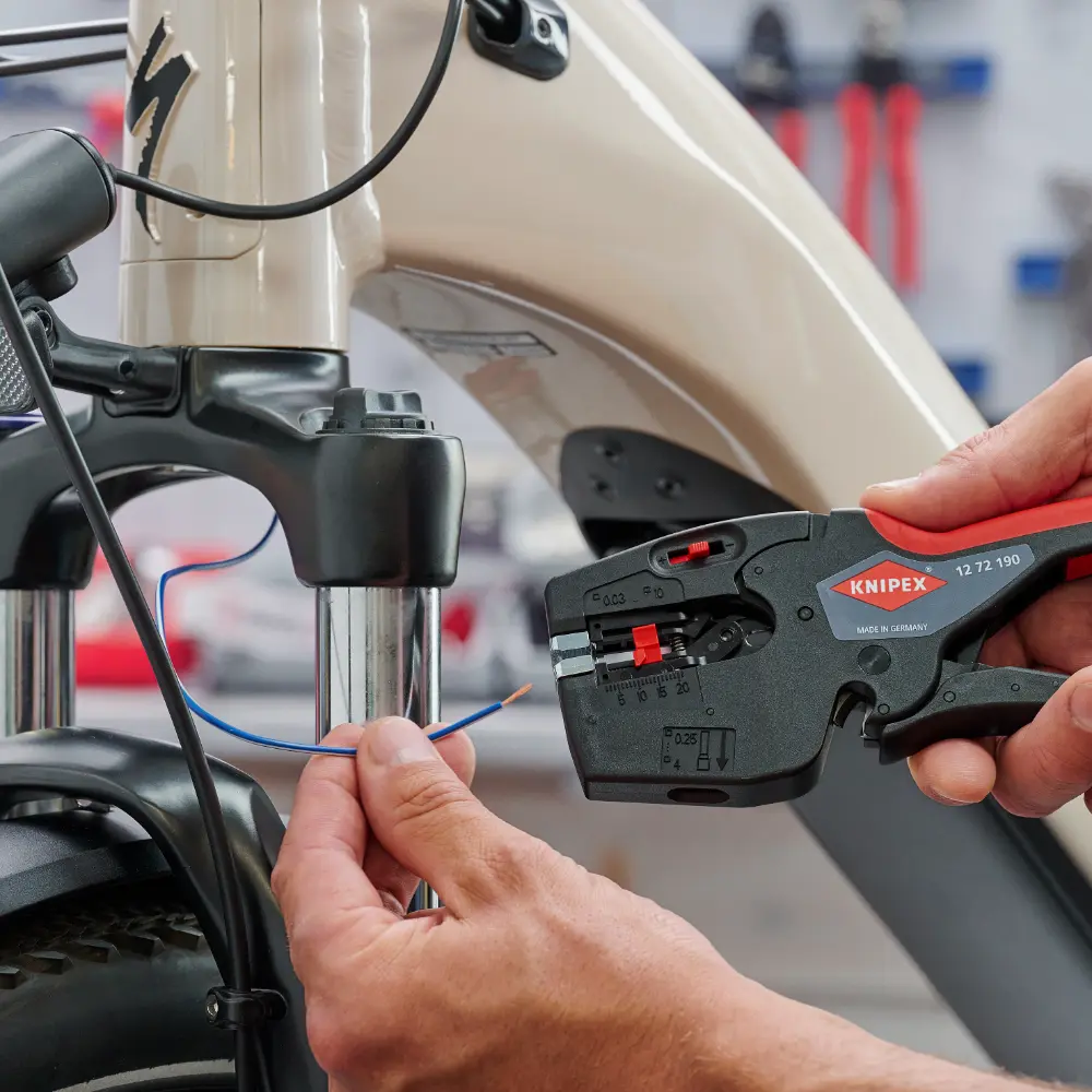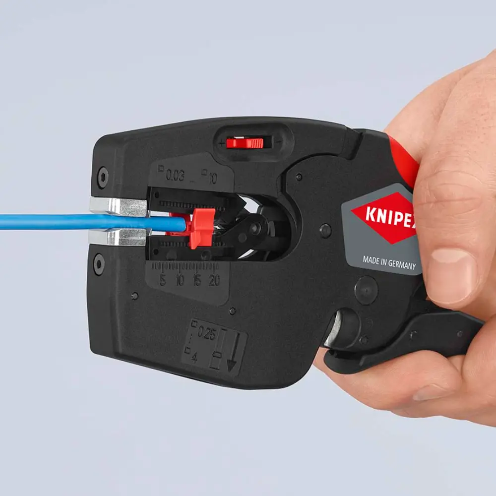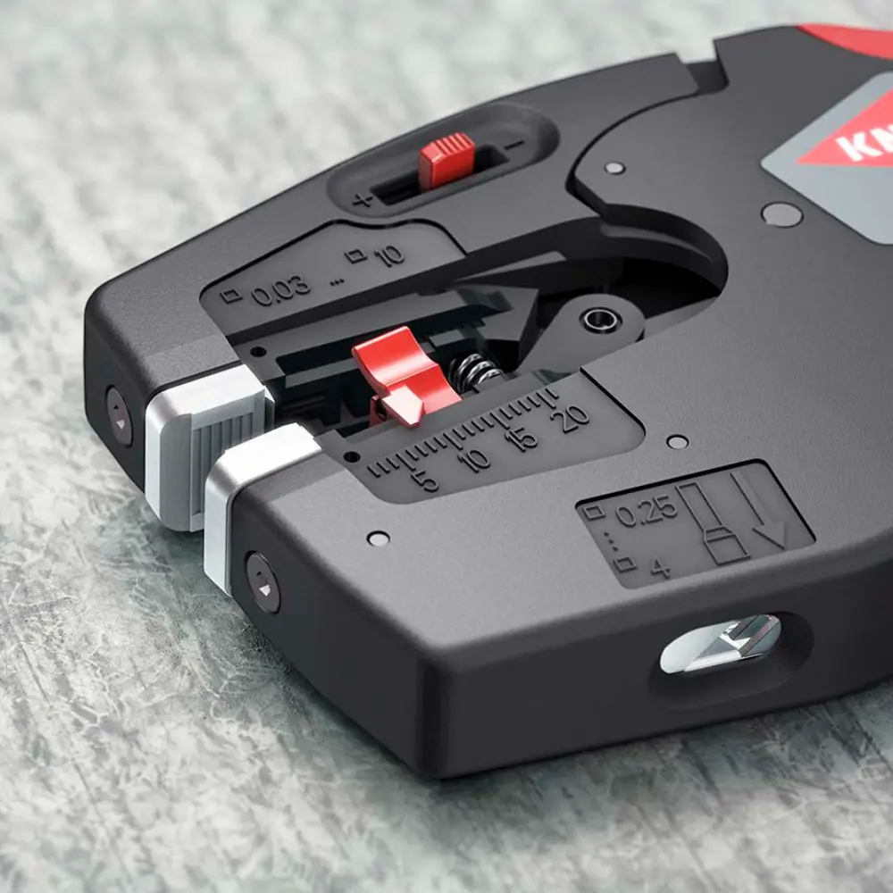 - Präzise abisolieren: automatische Größenanpassung mit Längenanschlag für exaktes, wiederholgenaues Arbeiten, mit Feinjustierung