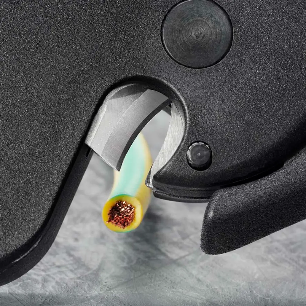 - Sauberer Schnitt von Cu- und Alu-Leitern feindrähtig bis 10 mm² (AWG 8), eindrähtig bis 6 mm² (AWG 10)