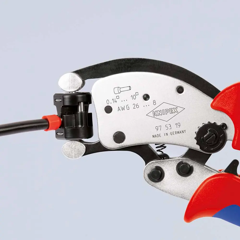 - Erweiterte Produktinformationen Twistor T Selbsteinstellende Crimpzange für Aderendhülsen verchromt 200 mm von KNIPEXCrimpkopf um 360° drehbar, mit 8 Rastpo… Mehr