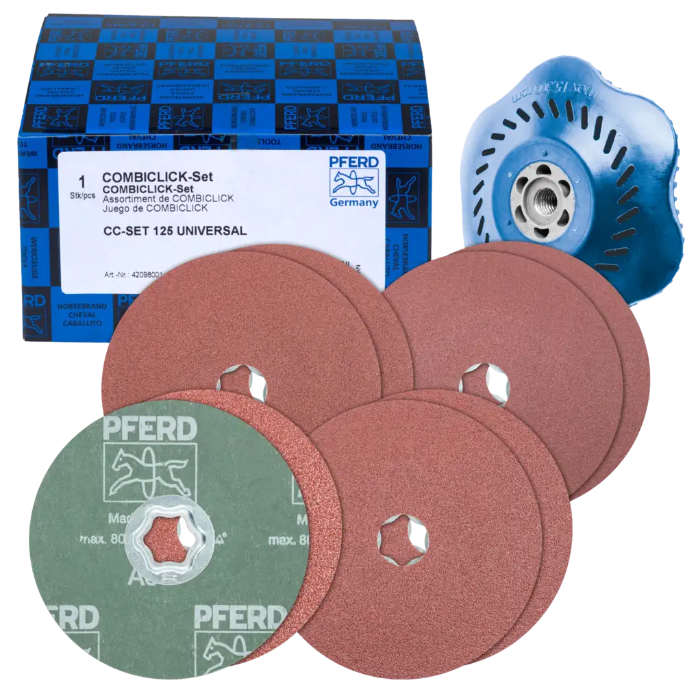 - Erweiterte Produktinformationen COMBICLICK-Fiberscheiben-Set Korund 125mm mit CC-H-GT-Stützteller für universelle Anwendungen von PFERD TOOLSDas COMBICLICK-… Mehr