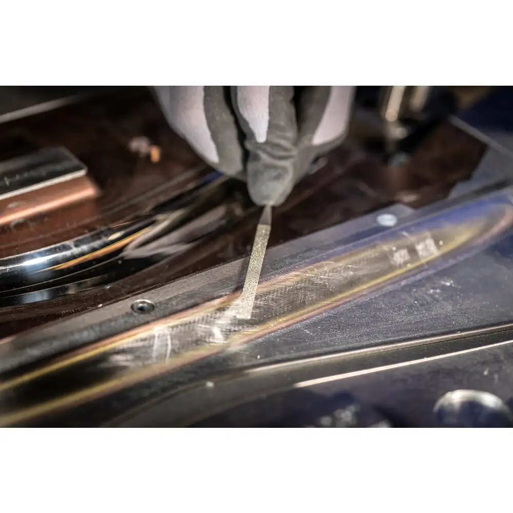 - Zugesetzte Diamantfeilen können in Petroleum oder antistatischem Kunststoffreiniger mit einer Feilenbürste gereinigt werden. Alternativ kann auch eine Ultraschallreinigung erfolgen. Oftmals reicht einfaches Ausklopfen aus.