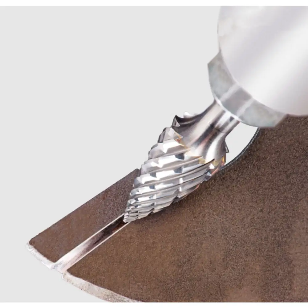 Hochleistungszahnung STEEL mit HICOAT-Beschichtung HC-FEP zeichnet sich durch eine hohe Härte und Verschleißfestigkeit aus. Sie erlaubt eine effektive Spanabfuhr durch verbesserte Gleiteigenschaften und ist sehr temperaturbeständig. Sie ermöglicht eine längere Standzeit der Werkzeuge sowie den Einsatz im höheren Schnittgeschwindigkeitsbereich im Vergleich zu unbeschichteten Frässtiften. Spitzbogenförmiger Frässtift nach DIN 8032, Spitze abgeflacht.Technische Daten: