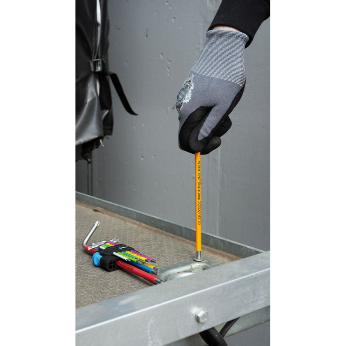 - Mit Haltefunktion am langen Schenkel: Durch die aus der Flächenpressung zwischen der Abtriebsspitze und Schraubenprofil resultierende Klemmkraft werden die Schrauben sicher auf dem Werkzeug gehalten