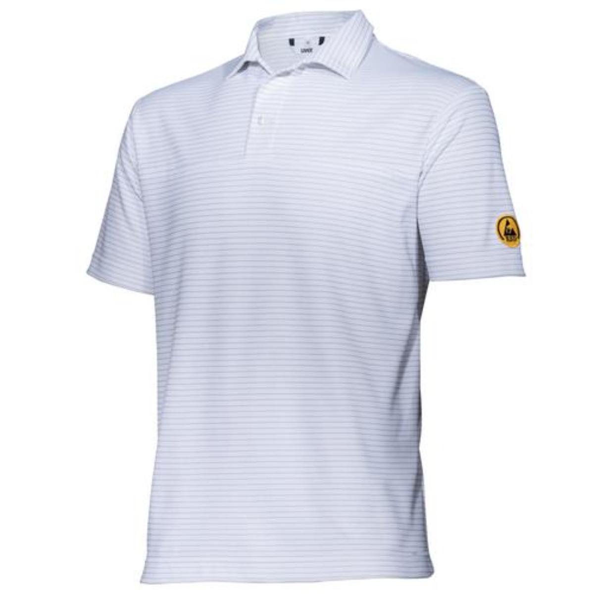 Das uvex Herren-Poloshirt uvex protection ESD besteht zu 54% aus Baumwolle, zu 44% aus Polyester und zu 2% aus Resistat. Das quergestreifte ESD-Shirt mit hohem Tragekomfort hat einen Polo-Kragen mit sichtbarer Knopfleiste, ein Vorderteil mit Querpass und wiegt etwa 185g/m².